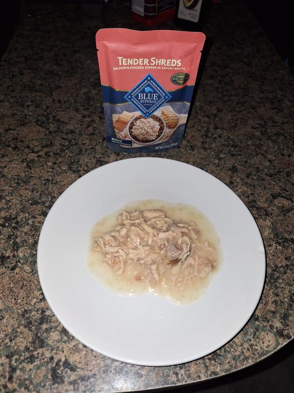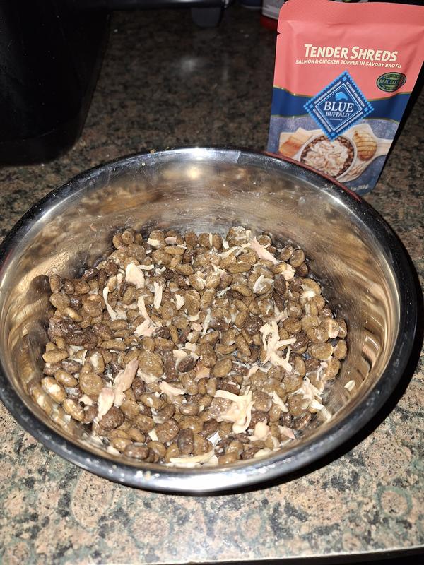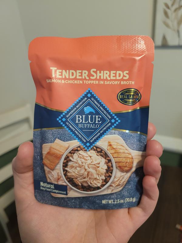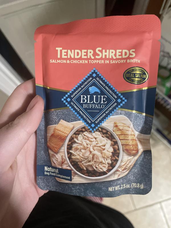 Blue Buffalo Tender Shreds Salmon & Chicken Toppers in Savory Broth, Wet Dog Food, 2.5-oz bag, 24 count