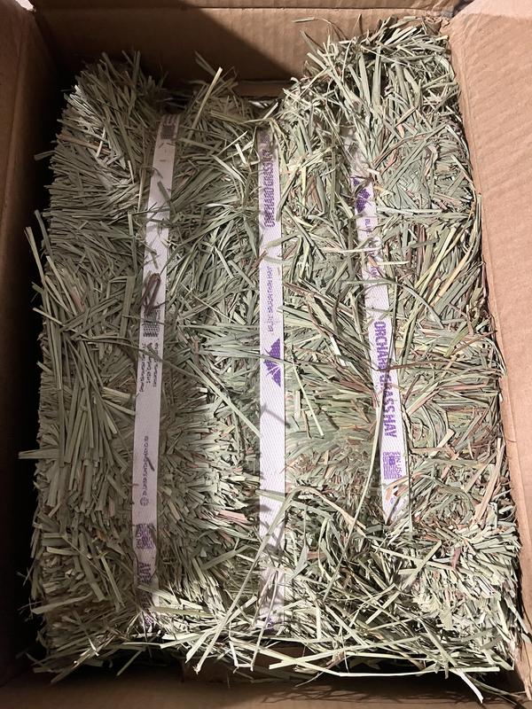 I’m from the Midwest and have had horses most of my life, so I’ve seen a lot of hay — and this hay is pretty. It’s green, soft, smells great, and mine wasn’t dusty at all. It definitely passed the horse’s seal of approval! This is orchardgrass hay, which has a nice balance of nutrition — typically around 10–12% protein, moderate calories, and a good mix of fiber and calcium. It’s richer and leafier than plain timothy or prairie grass but not as heavy or calcium-rich as alfalfa, which makes it a great “middle ground” hay. If your horse is older or not an easy keeper (but doesn’t have other health issues), this would be a choice worth taking a look at. If your horse is a pasture pet, has laminitis, metabolic concerns, or needs very low-sugar hay, you might want to check with your vet before switching — orchardgrass can sometimes run a bit higher in non-structural carbohydrates depending on the cutting. The only thing that would give me pause is that I couldn’t find any information about which cutting this is. To be fair, that’s understandable — labeling every box by cutting would be impractical — but when you buy hay, that’s something most horse owners like to know. This particular vendor offers a number of different types of hay, so if orchardgrass doesn’t fit your horse’s needs, there are other good options to choose from. The box was well-packed and very compressed, which makes it easy to handle and store — especially nice if you don’t want to wrestle full-size bales. The outside of the box had a little FedEx grime (they can’t seem to deliver anything that doesn’t look like it’s been on a cargo ship for a week), but the hay inside was perfectly clean and fresh. The price is reasonable for what it is — especially if you’re in an area where hay prices are sky-high. You could certainly use this for more than just horses; it would work well for goats, rabbits, guinea pigs, or other small livestock. My horses acted like they’d been seated at a fine dining restaurant. Overall, I’m impressed. I didn't know what to expect from boxed hay. Its a different way to buy hay. But it’s quality orchardgrass hay at a fair price, shipped well, and clearly processed with care.