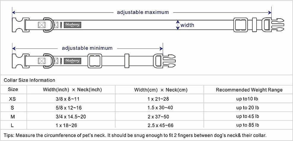 The X-Small size collar fits necks measuring 7.5-10 inches. The Small size collar fits necks measuring 12-16 inches. The Medium size collar fits necks measuring 14.5-20 inches. The Large size collar fits necks measuring 18-26 inches. We recommend measuring your pet to find the perfect size. The sizing chart may be located by clicking the “Size” tab, next to the “Description” and “Instructions” tab, just under the product photos