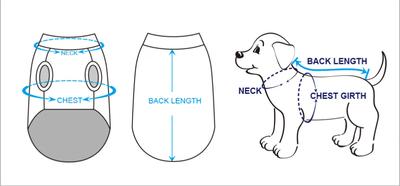 Refer to the included photo for reference on measurement placement. Please note that the size chart shows the actual measurements of the garments. Always look at the size chart for neck length, chest girth, and back length before purchasing. Please allow sufficient room to slip two fingers between the measuring tape and the dog's neck and girth.