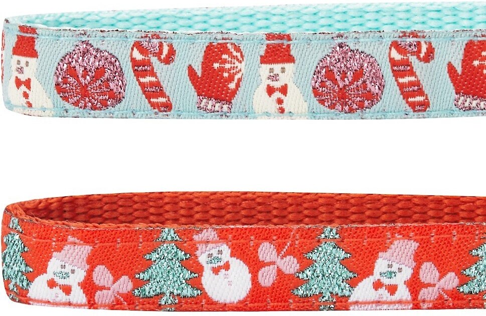 - Two cat collars—one with red candy canes, gloves, ornaments and snowmen on sky-blue background; another with Christmas trees and snowmen on red background.