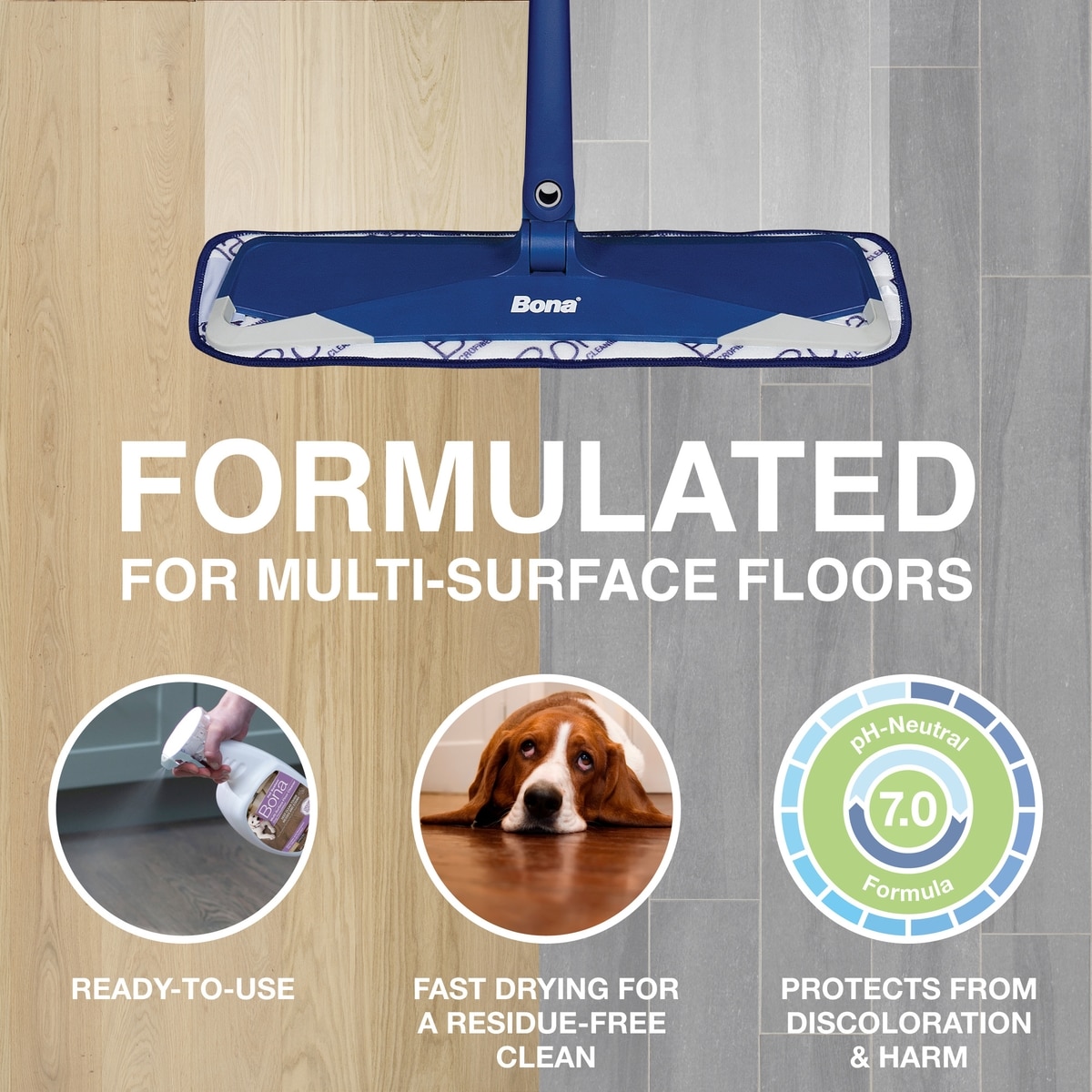 This cleaner is perfect for sealed or finished, and unwaxed or unoiled floor. Surfaces should be sealed including the grout lines, unsealed stone or grout lines may cause staining. Bona's oxy powered floor cleaner deep cleans and penetrates through tough stuck-on stains, tracked in mud, and accident messes with the cleaning power of Hydrogen Peroxide The solution lifts away stains while continuing to deep clean set-in stains and odors from pet accidents for up to five days. The Odor Guard Technology eliminates and neutralizes urine and other organic odors upon contact. It is a Safer Choice Certified product that meets U.S. EPA products for containing ingredients that are safer for use in your home and around your pets, family, and the planet for a cleaner and healthier home. Designed to effectively clean hardwood, stone, tile, laminate, vinyl and LVTP floors. For best results, spot treat soils immediately. For spot cleaning an old stain, do not allow the cleaner to dwell for any longer than 2-3 minutes on Hardwood and Laminate