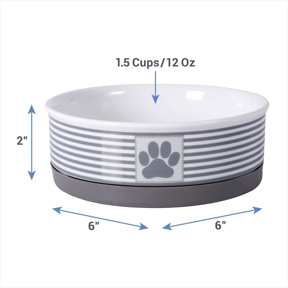 Bone Dry Striped Non-Skid Ceramic Dog & Cat Bowl Set, 1.5-cup, 2 count, Grey