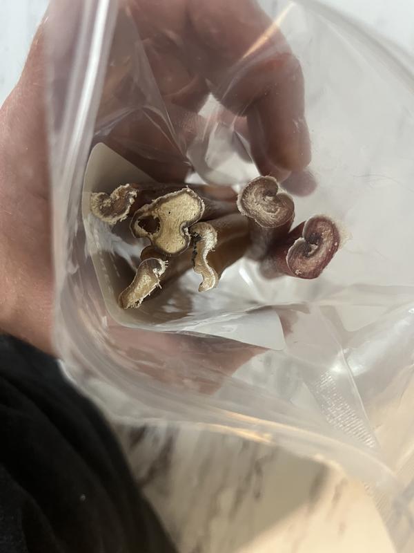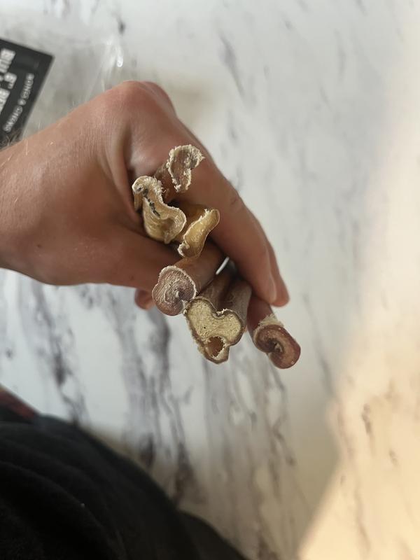 My dog loves these but the quality is all over the place. In my pack of 6, 3 of them look great and full while the others 3 appear to be cut in half. They are very thin and about half the size of the other proper bully sticks. I can understand they won’t all be the same but these aren’t that cheap so it’s a shame to see such a dramatic difference in size/quality.