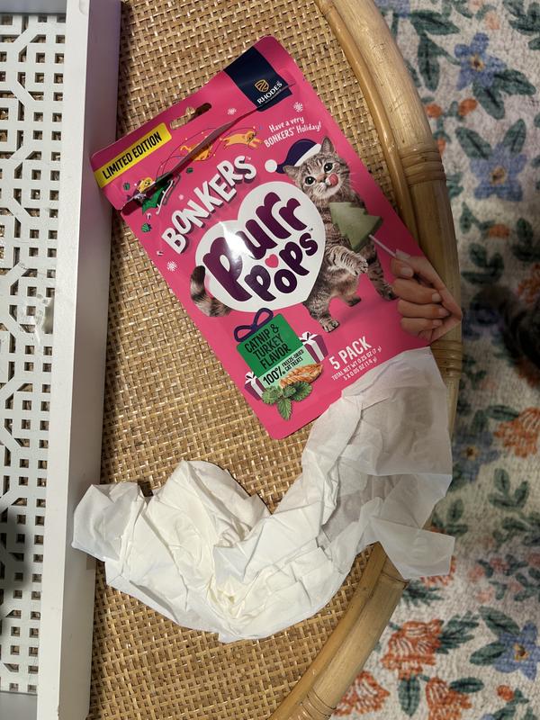 My cats went absolutely crazy for the Bonkers Purrpops Happy Holidays Edition treats. They devoured them the second I opened the package. I have never seen them get so excited for a treat before. Even my picky cat was all over these. I will definitely be buying them again.
