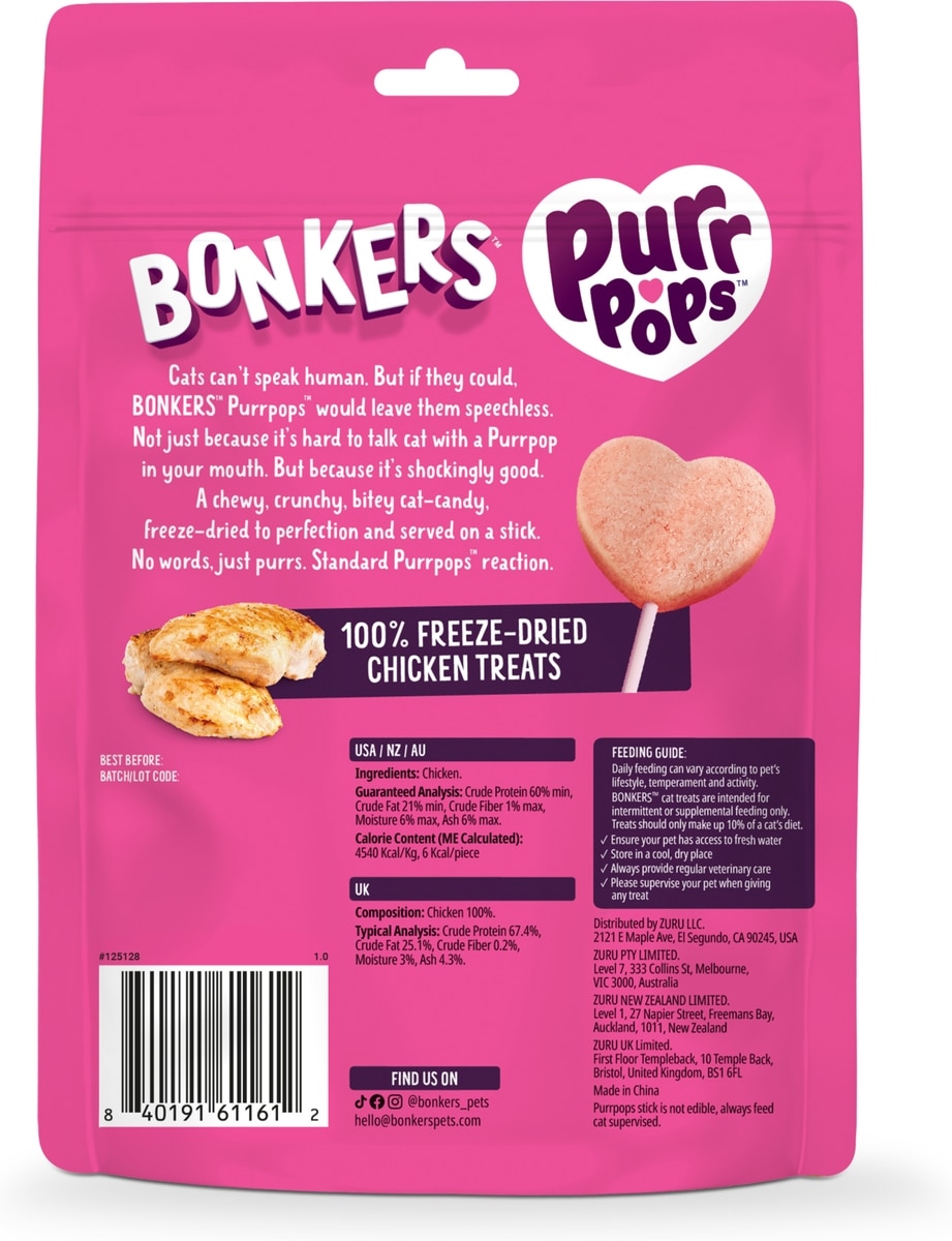 Daily feeding can vary according to pet’s lifestyle, temperament and activity. Bonkers cat treats are intended for intermittent or supplemental feeding only. Treats should only make up 10% of a cat’s diet.