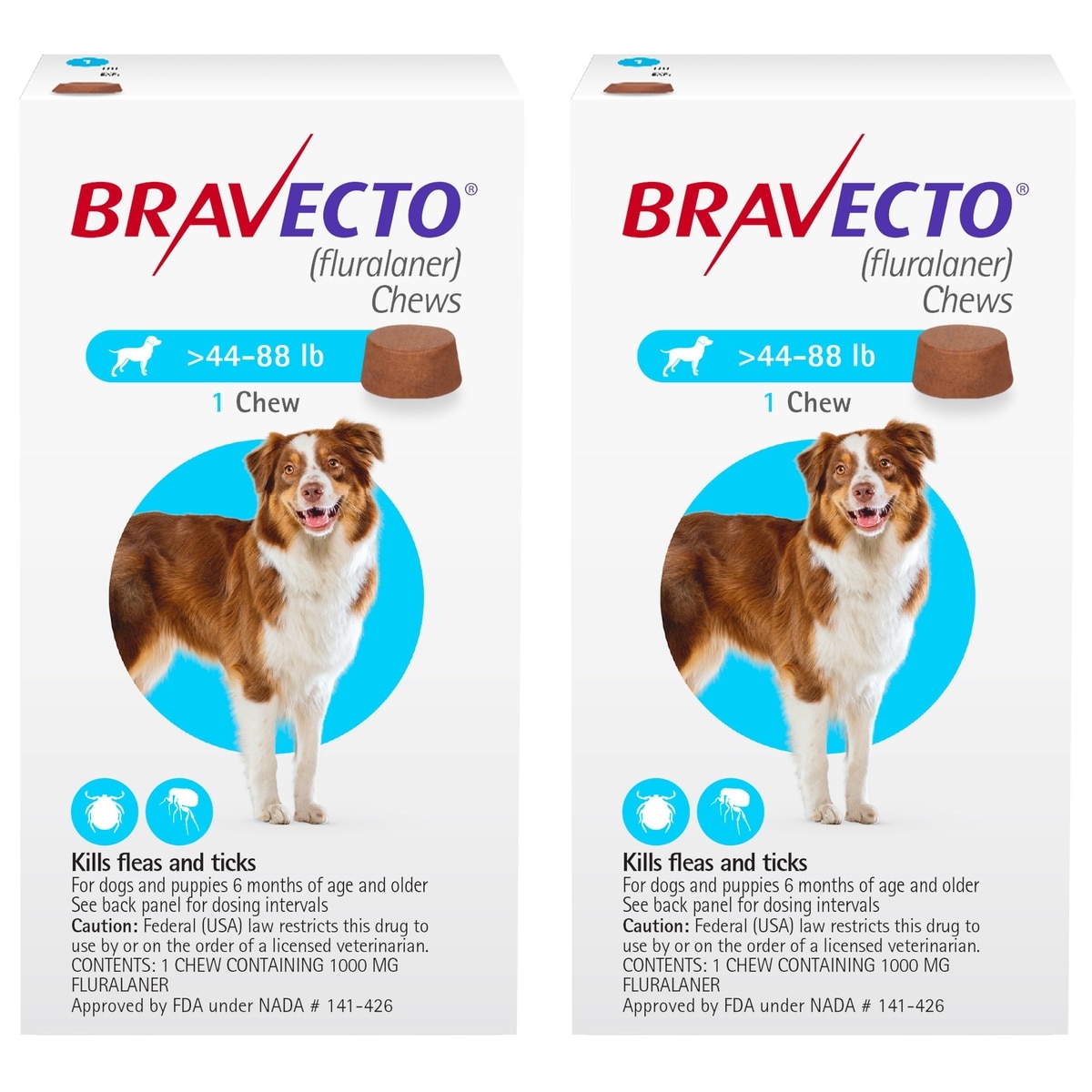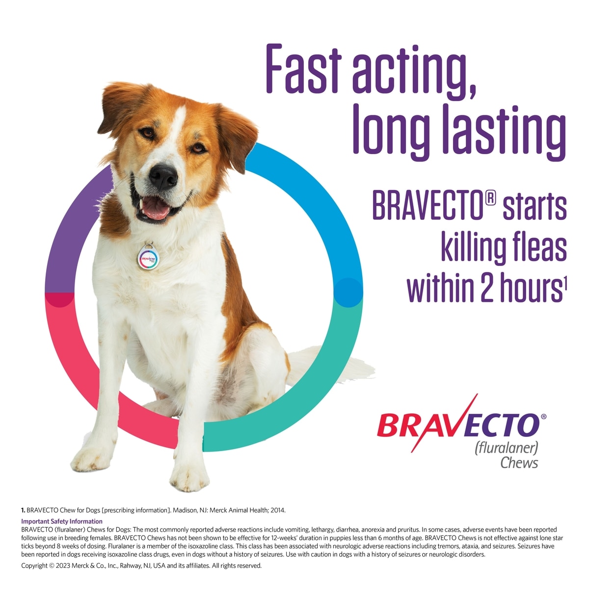 After you give your pet Bravecto, it quickly reaches tissue fluids just under your dog's or cat's skin. When fleas and ticks feed, they ingest Bravecto and die. Bravecto Chew for Dogs starts killing fleas (Ctenocephalides felis) within 2 hours, and kills ticks (Ixodes ricinus) within 12 hours. Bravecto Chew for Dogs kills fleas, prevents flea infestations, and kills ticks (black-legged tick, American dog tick and brown dog tick) for 12 weeks. Bravecto Chew for Dogs also kills lone star ticks for 8 weeks.