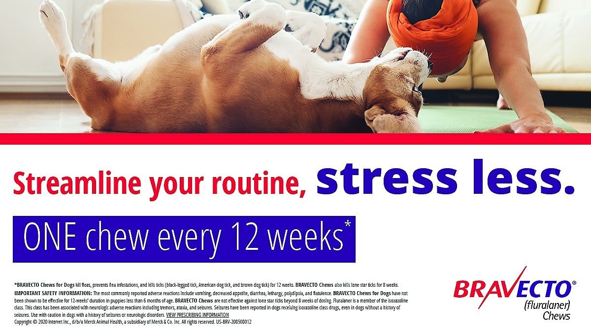 Bravecto is the only flea and tick treatment to last 12 weeks* with one convenient chew or topical dose. That means nearly 3X longer lasting protection than common monthly treatments. The long-lasting efficacy breaks the flea life cycle and drives fleas into extinction with one dose. And, Bravecto kills ticks faster, killing 100% of attached ticks in 12 hours – whereas other treatments can take over 48 hours.