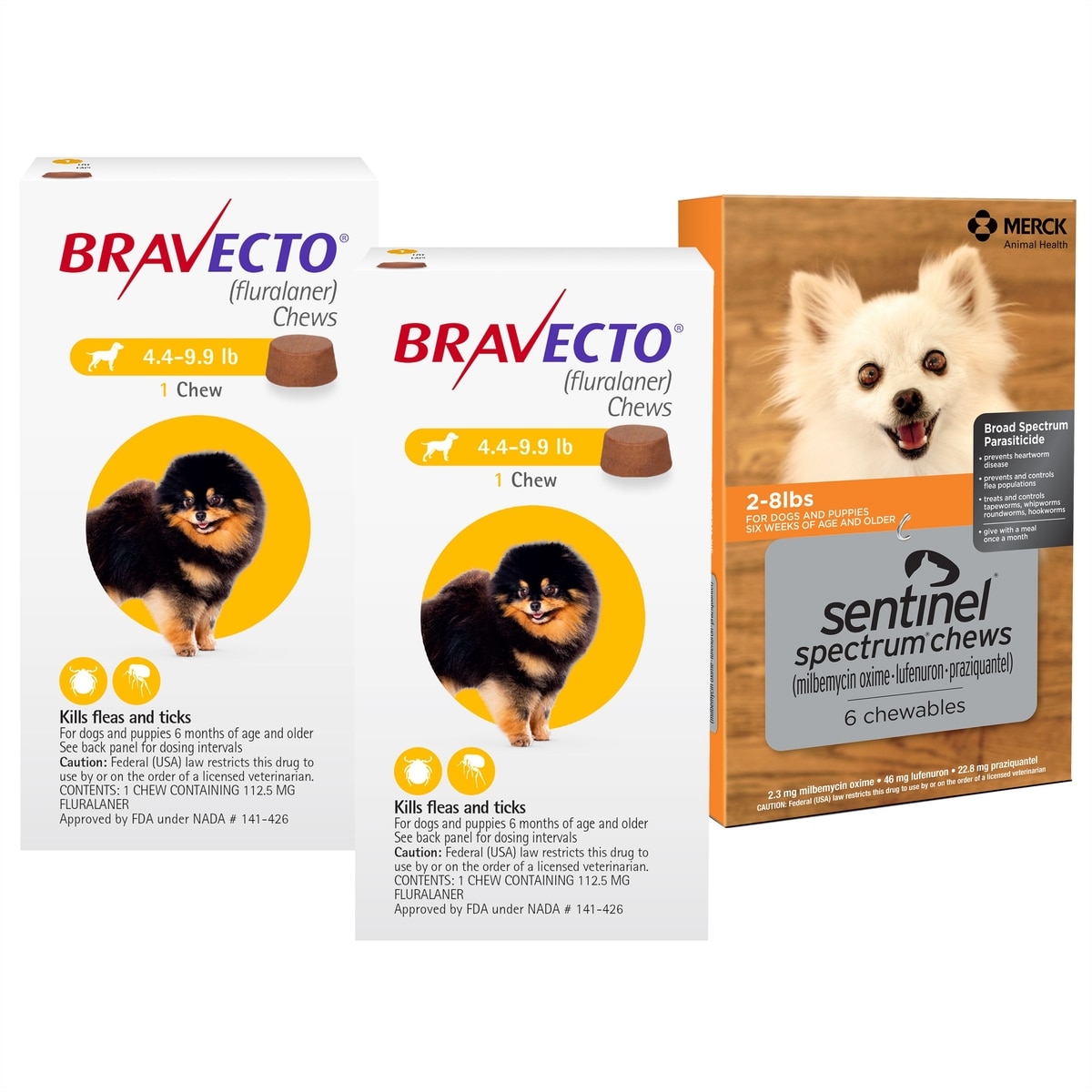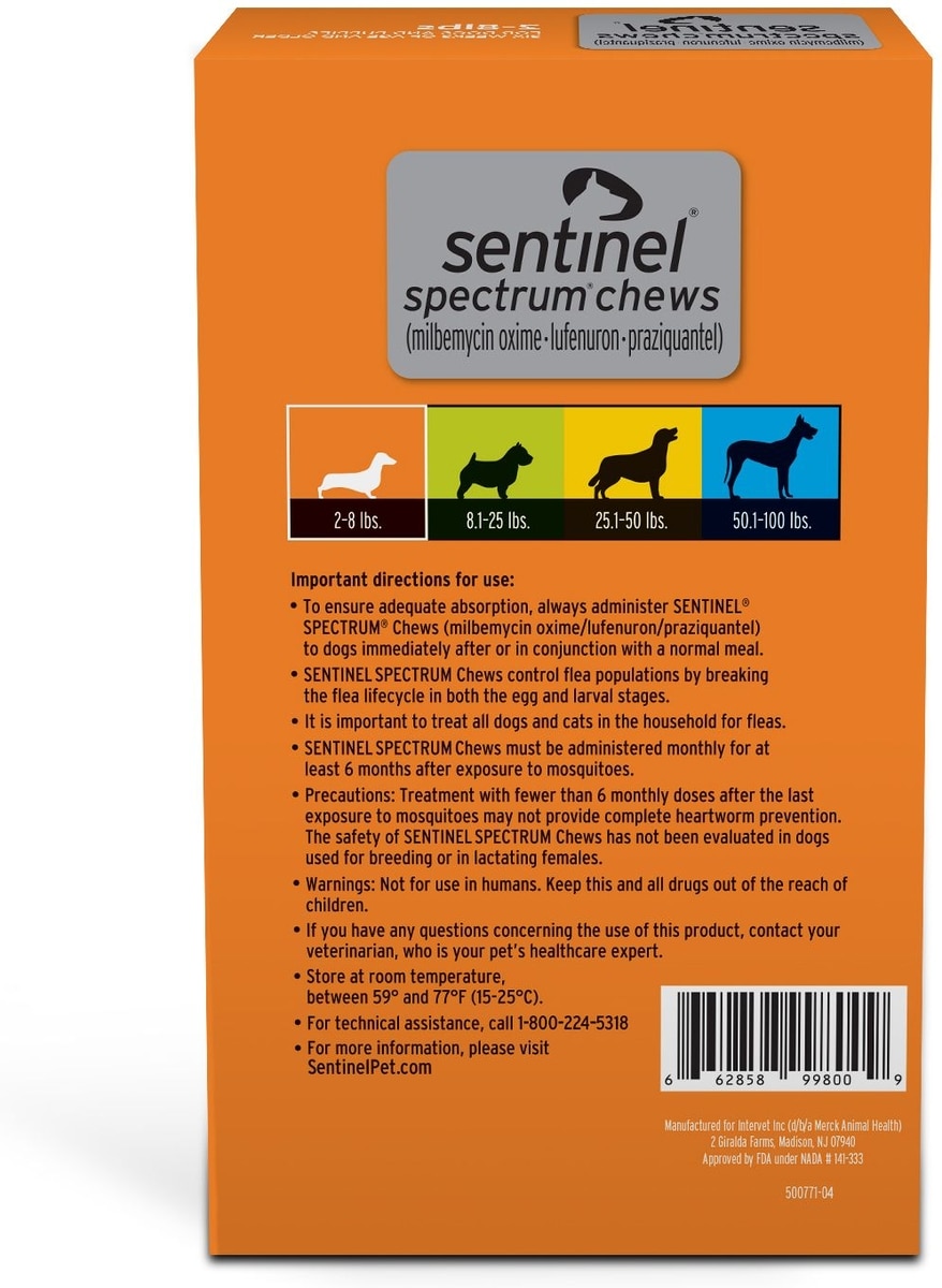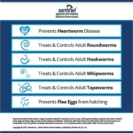 Sentinel Spectrum Chew for Dogs, 6 Chews (6-mos. supply) —Your furry friend must have a current heartworm test result on file with your veterinarian in order to be prescribed heartworm medication. Please visit your veterinarian to have this test performed annually to protect your four-legged friend. Sentinel Spectrum is a monthly oral preventive prescription that guards against heartworms, adult roundworms, adult hookworms, whipworms, and prevents the development of flea eggs. It protects your dog against heartworm disease and intestinal worms, all in a palatable, beef-flavored chewable.