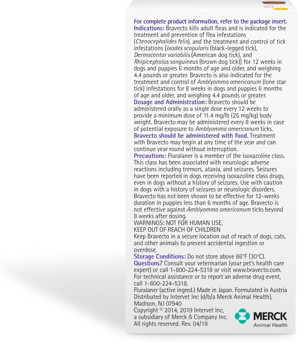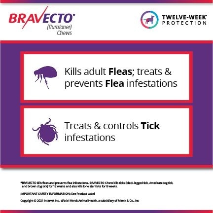Bravecto Chew for Dogs, 2 Chews (6-mos. supply) - Bravecto provides up to 12 weeks of protection against fleas and ticks and may terminate Lone Star ticks for up to 8 weeks, and kills 98.7% within 24 hours. Protect your dog from ticks and fleas the easy way with Bravecto. These chews terminate adult fleas, help treat and prevent flea infestations and help treat and control tick infestations. Best of all, each chew is flavored, so your dog will actually look forward to taking his medication for a change. Bravecto also comes in a topical solution for dogs and cats (sold separately).