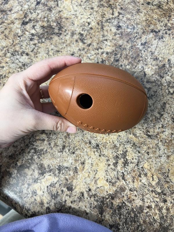 The football is very durable, and not very big. It is very slick and extremely hard to get a grip to carry it around. Ted is a 10 yr old 30 lb standard size pomeranian, not the little small fluffy kind. He had a hard time trying to pick this up, sometimes he could bite it on the end and carry it around some, but it is mostly a football that he would push around with his nose. The hole for the treats is a little bit small but I guess that is okay. He was excited to get it out of the box but the excitement lasted about 2 hours. There are still treats in it as he is not very interested with it unless you make a big deal about trying to get it. I think it might be better if you had a larger dog but it's not really something a medium to small dog would be interested in. I would not really recommend this treat ball unless you had a larger dog.