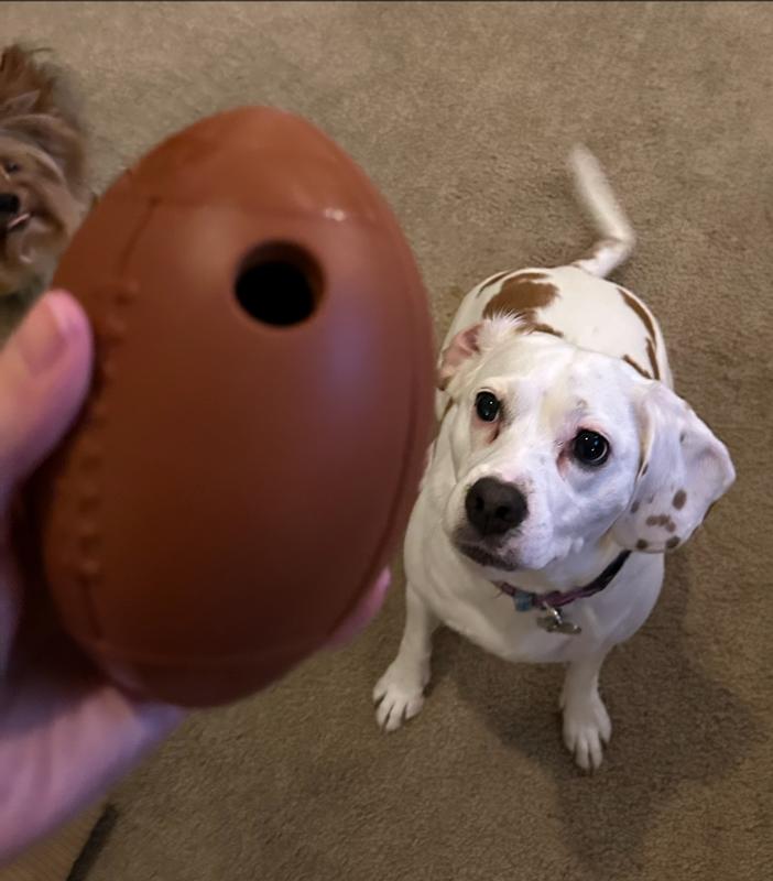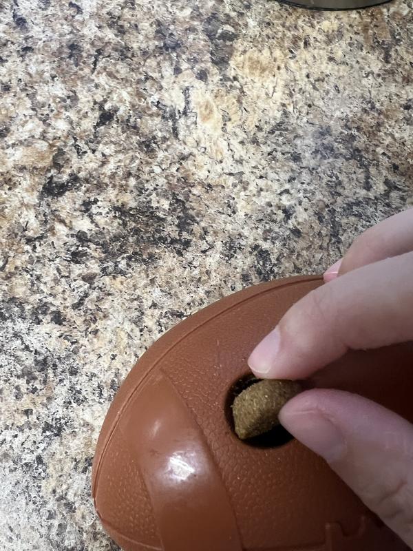 Easy to use and fun for our large dogs. It is easy to load treats and depending on the size of the treats it is easy for the dogs to get them out. The dogs find the football is a fun toy in addition to dispensing treats. I put small treats in that came out quickly and some the same size as the dispensing hole to make it more challenging. Chewy sent the order quickly and is always easy to work with.