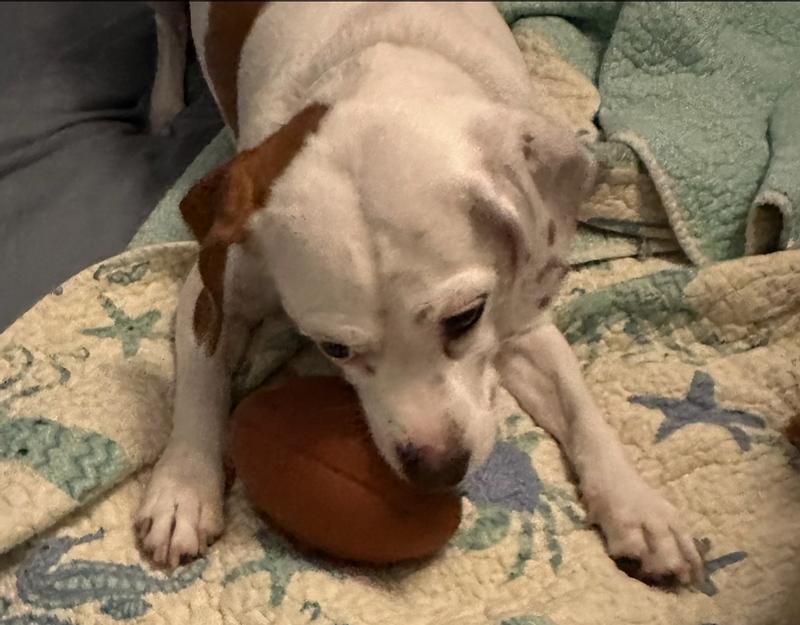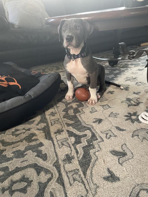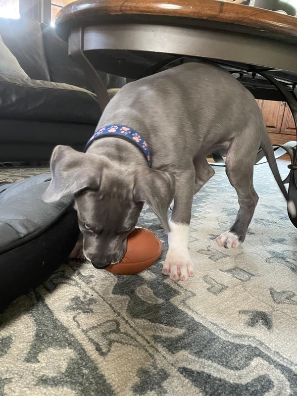 Perfectly sized for medium and large dogs, this cute lil’ football kept our curious pups entertained! It’s got a tough but pliable feel, meaning it stands up to heavy players but isn’t rough on the pup’s mouth. The texture also keeps it from being excessively noisy when Siggi tosses it around. The treat repository fits extra small or training treats, which is perfect since it has a huuuuge capacity. More treats = longer we can keep them entertained. This is a total game day win for us!