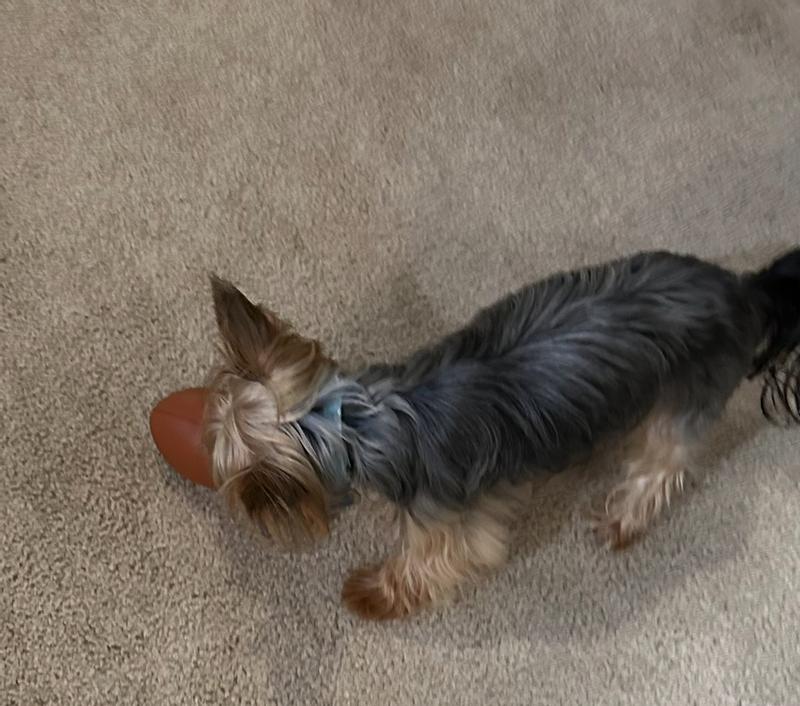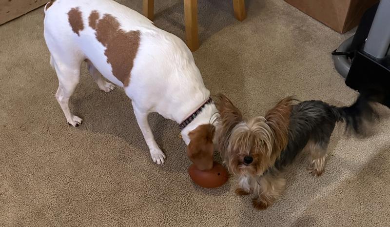 Super cute toy! My dogs love this thing. It’s very easy for them to move around with their nose or feet, and they chase it all over the house trying to get their food out. Definitely a great way to provide enrichment for them and a tasty snack. 10/10
