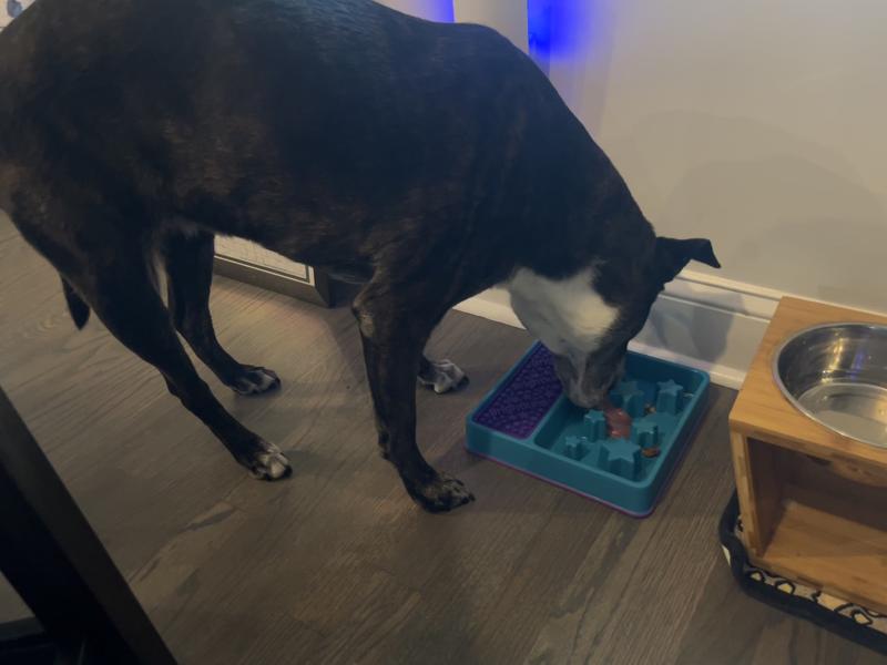 What I loved about this product is that it did its job while adding something new and fun to mealtime! My French Bulldog is known for scarfing down his food, so I needed a bowl that would slow him down and help with digestion. This slow feeder did exactly that! The star-shaped obstacles are placed in just the right spots, causing the food to spread out across the bowl. This forces my dog to move his head around and take his time eating, which is exactly what I was hoping for. The lick mat was also a hit! I poured some coconut water onto it and popped it in the freezer. After Bandit finished his meal, he stuck around and happily enjoyed his frozen treat. It was a great way to keep him engaged and satisfied after eating.
