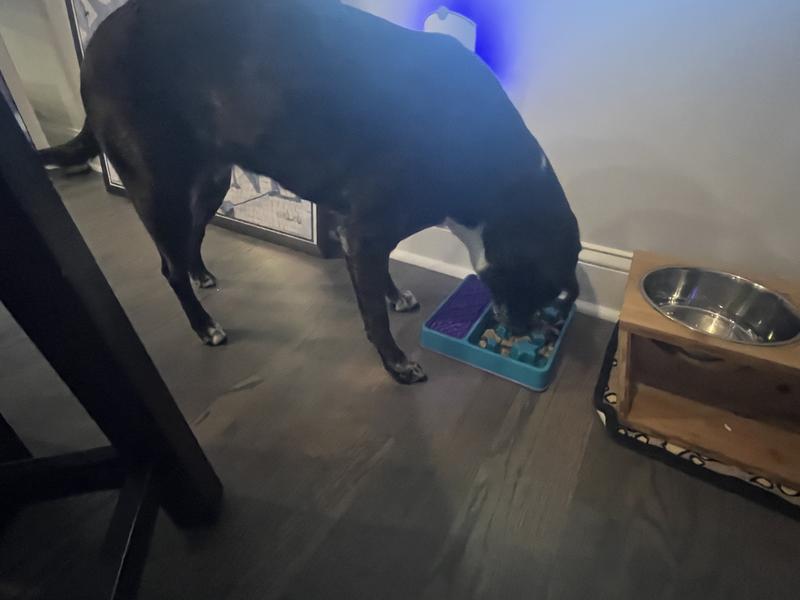My ten year old Golden Retriever has been having some digestion issues and this item definitely slowed his eating down and I think he enjoyed the challenge of getting
