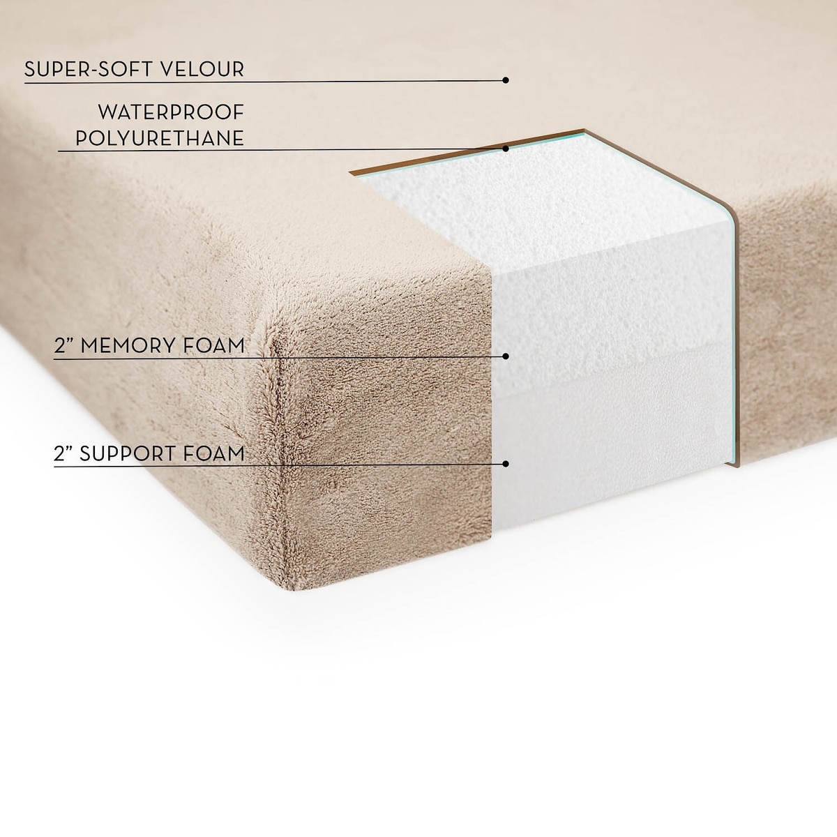 The bottom layer features 2 inches of high-density support foam and the top layer features 2 inches of memory foam.