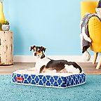 This pet bed features a 100% polyester cover. The Navy and Red models feature Polyester Faux Fur on top.