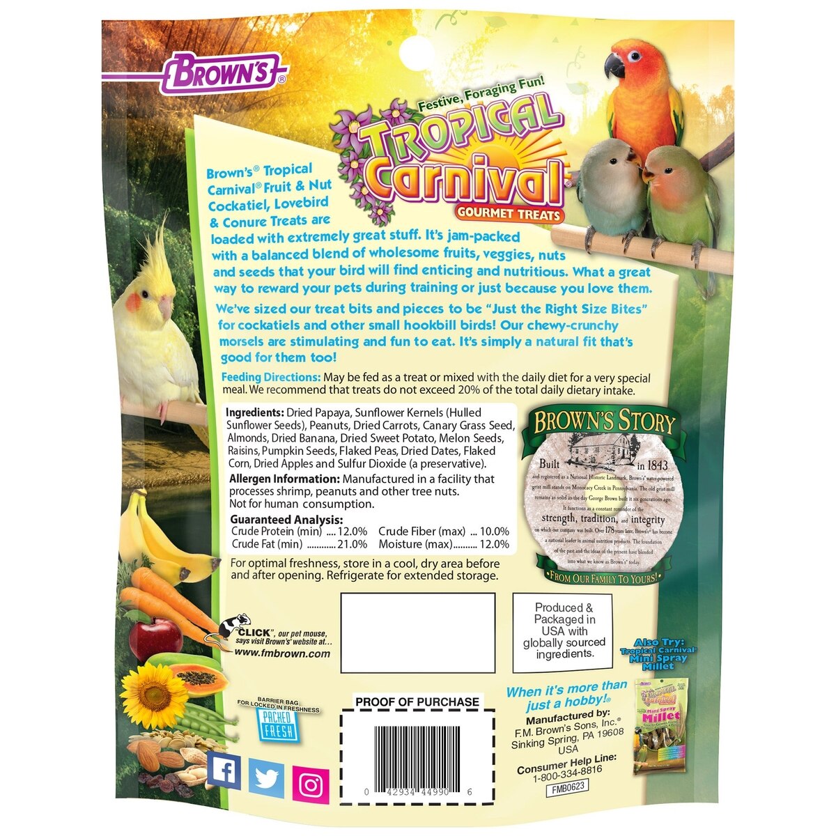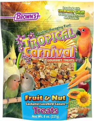 - Brown's Tropical Carnival Fruit & Nut Parrot Bird Treats, 12-oz bag$8.99 Chewy Price$13.99 List Price$8.54 Autoship PricePromo, New Customers Only: Spend $49+, Get $20 eGift Card