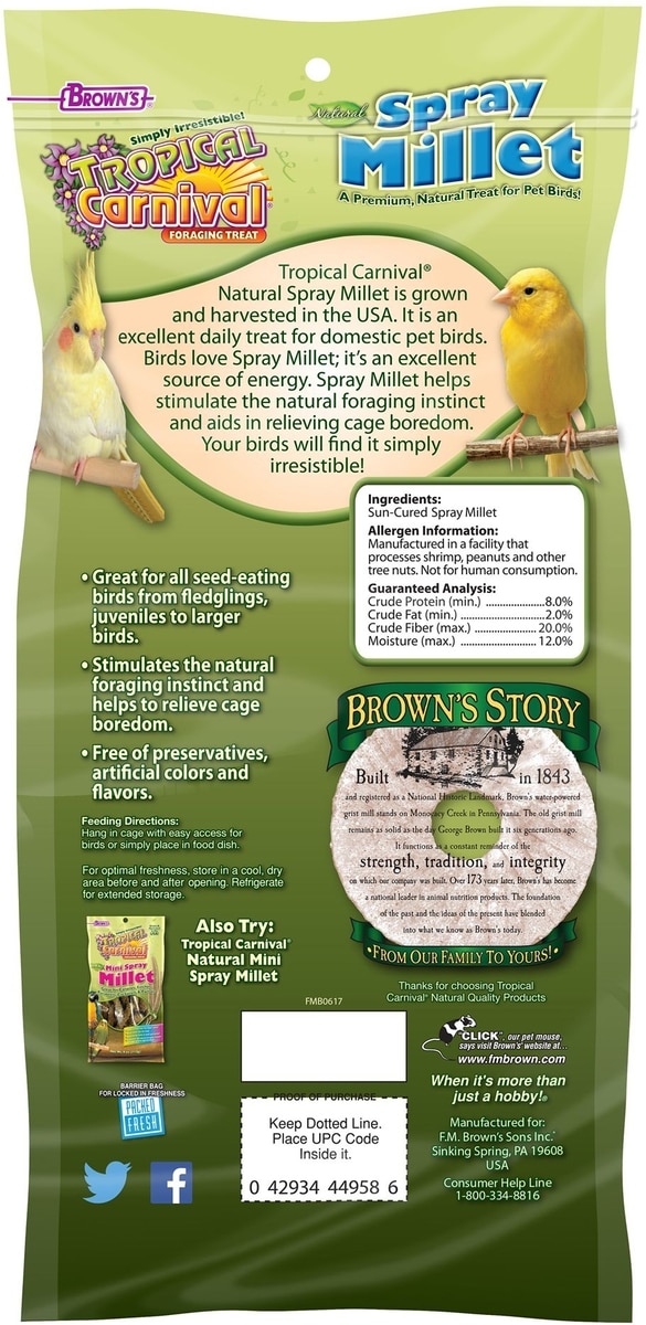 - Brown's Extreme Natural Millet Spray Bird Treats, 12 count$7.52 Chewy Price$7.99 List Price$7.14 Autoship PricePromo, New Customers Only: Spend $49+, Get $20 eGift Card
