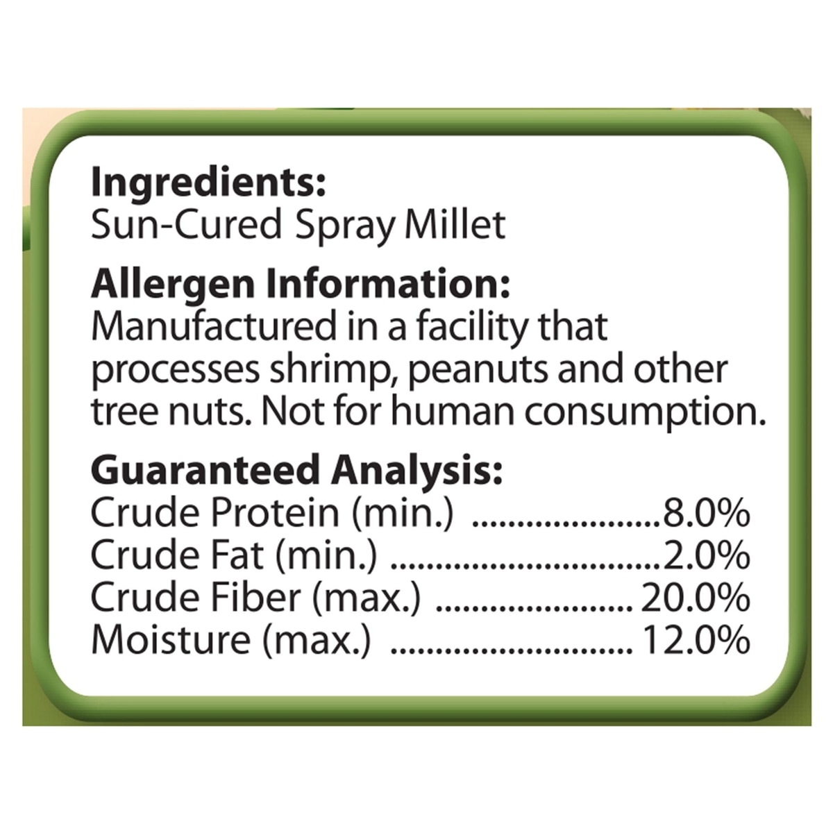 This treat is recommended for seed-eating birds such as canaries, finches, parakeets, cockatiels and parrots.