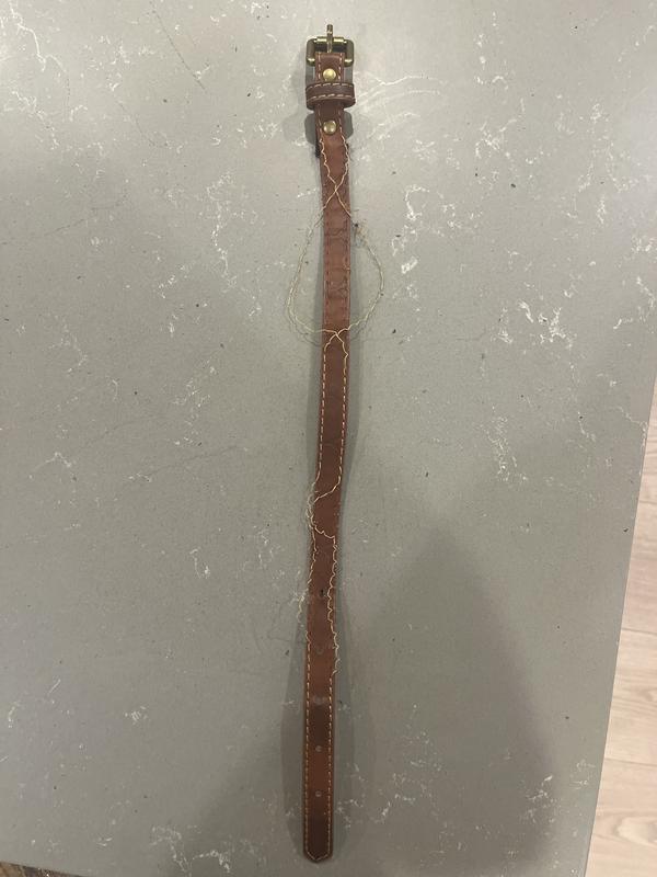 Very cheap leather. I didn't even put it on my dog it was obviously sub par quality upon visual inspection. I stretched it over 4 inches with my hands and the leather cracked as well.