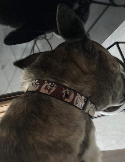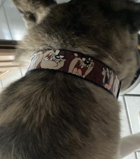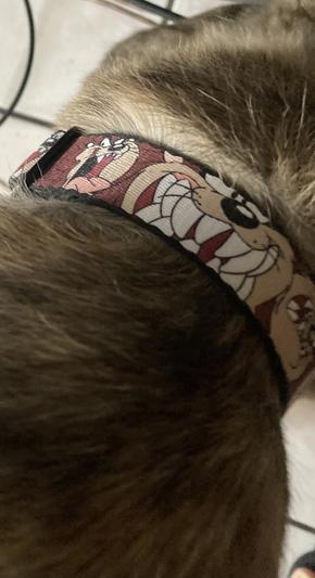 My little Tasmanian devil loves his new collar. The collar looks even better in person than in the picture. The color and character is bright and vivid, the buckle latch is the perfect size it’s not too big and clunky, and the weight of it all is just right. I love it and definitely recommend it.