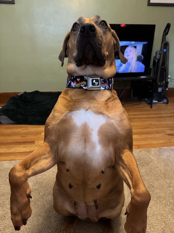• The miniature authentic seatbelt buckle makes the collar easy for you (not your pup) to take off—simply press the center button to release the clasp!