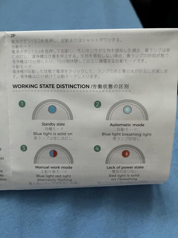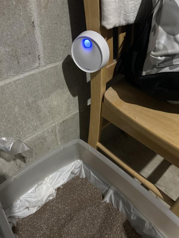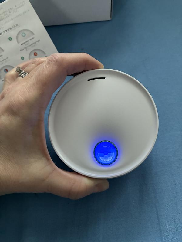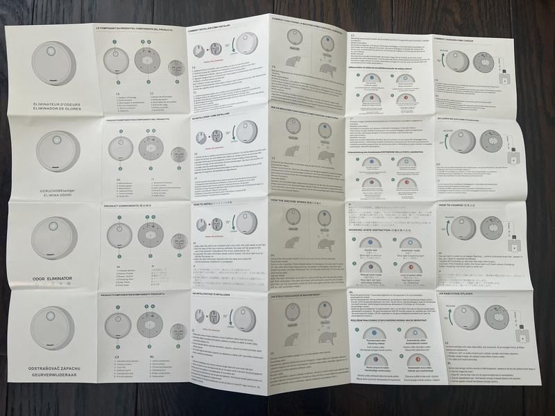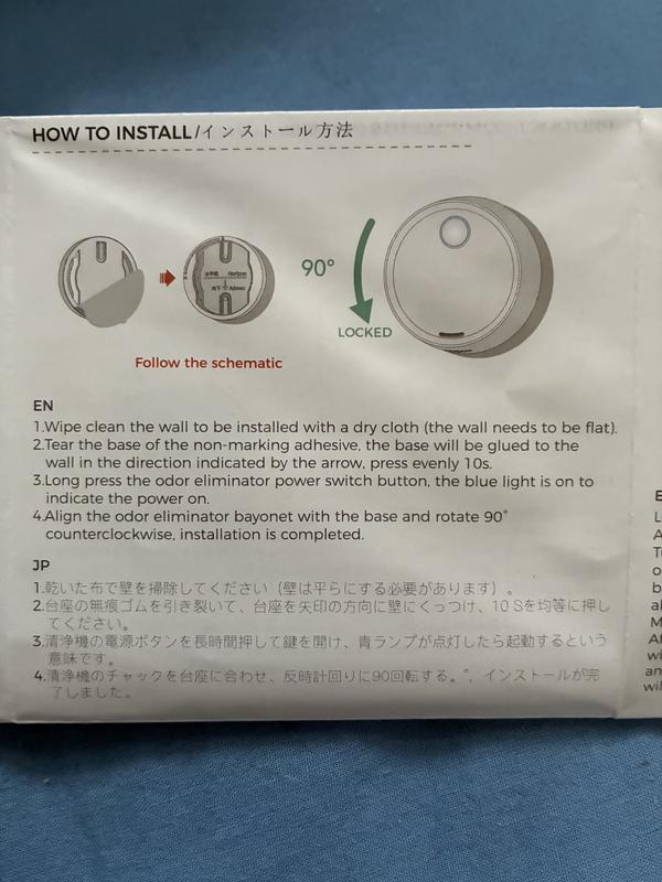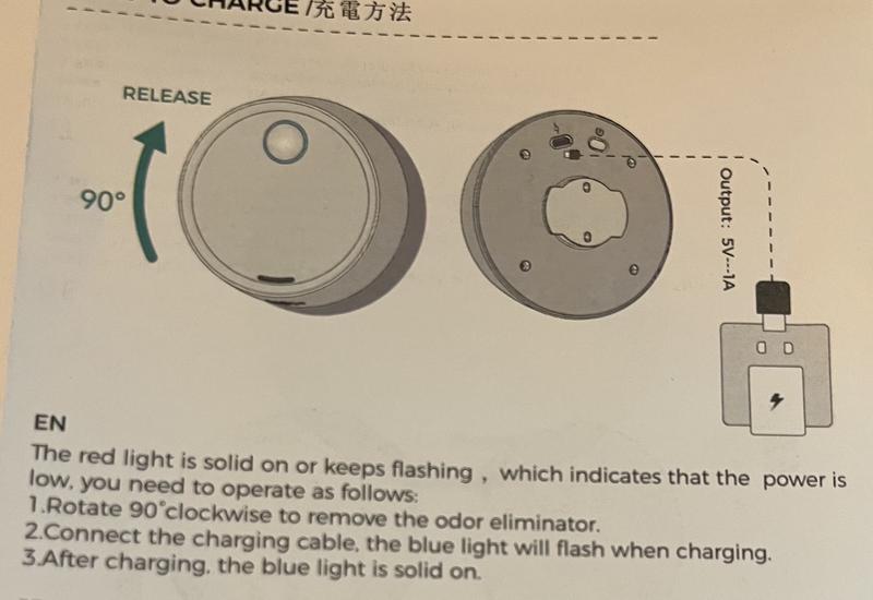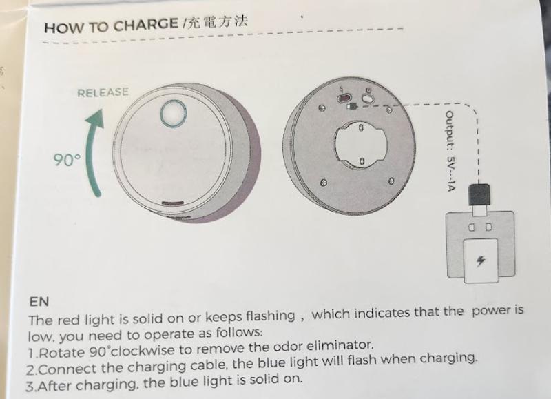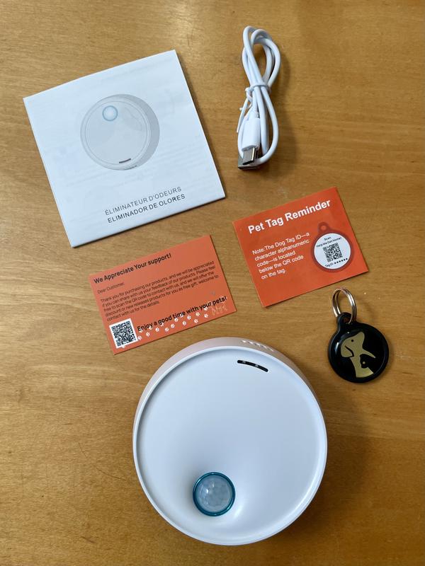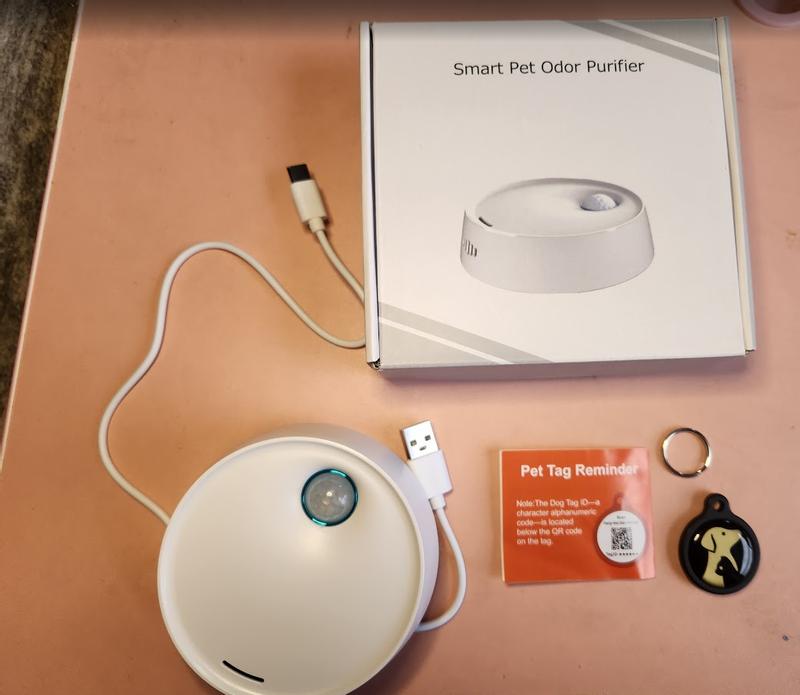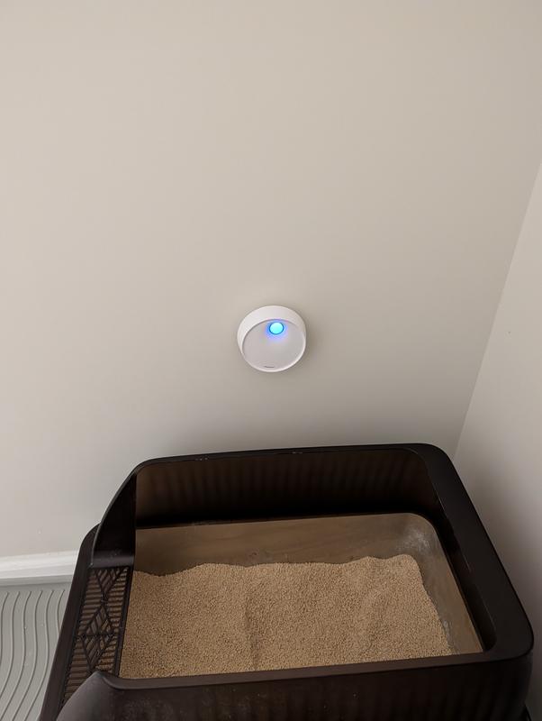 Aesthetically this is a nice little unit 3" in diameter. It's all self-contained and does not require any inserts or filters. It's packaged in easily recyclable cardboard with a charging cord, a bonus pet tag, and instructions in 16 different languages. The English translation leaves a lot to be desired including clarity on how to operate this deodorizer. The first thing I did was charge the unit. It went from a blinking blue light to a solid blue light. I'm not sure which means that's it's on and working? If you hold down the blue button while it's solid it'll go to a combo red/blue light which I believe is a manual setting. I then stuck it to the tile wall outside the litter box. It adhered quickly and easily and was ready to go. I would like to set it in Automatic mode and I've looked through all of the reviews and still not sure what that is. Solid Blue? Blinking Blue? A quick Google search didn't uncover a more info about this specific product. I will keep reading these reviews as they come in. I'm hoping Solid Blue means it's on and working, and if there's a way to edit, I will come back and review the efficacy of this product.