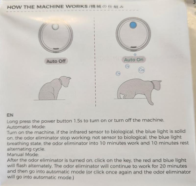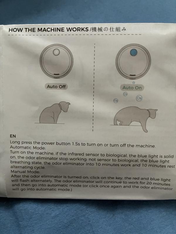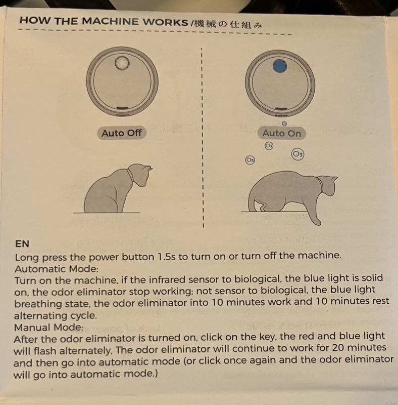 First of all, there are far too many directions in multiple languages making it difficult to locate the ones in English. Secondly, the directions are poorly written, obviously by a non-English speaking person. Thirdly, the directions indicated you need to "click" on "the key" to change between automatic function and manual function, but there is no part identified as a "key." The diagram shows a sensor, outlet, power switch, charging port, snap parts, and fixed seat. None of those indicates a "key." So, the unit is attached to one of my litter boxes, however; nothing happens. The unit is charged, the blue light is on, and it has yet to dispense any odor-eliminating scent. Of course, my cats are fascinated by it, but I could have bought several toys that would have piqued their interest and been more useful. I would not recommend this product.