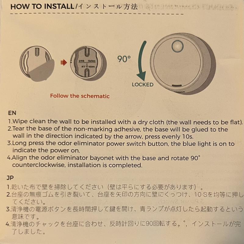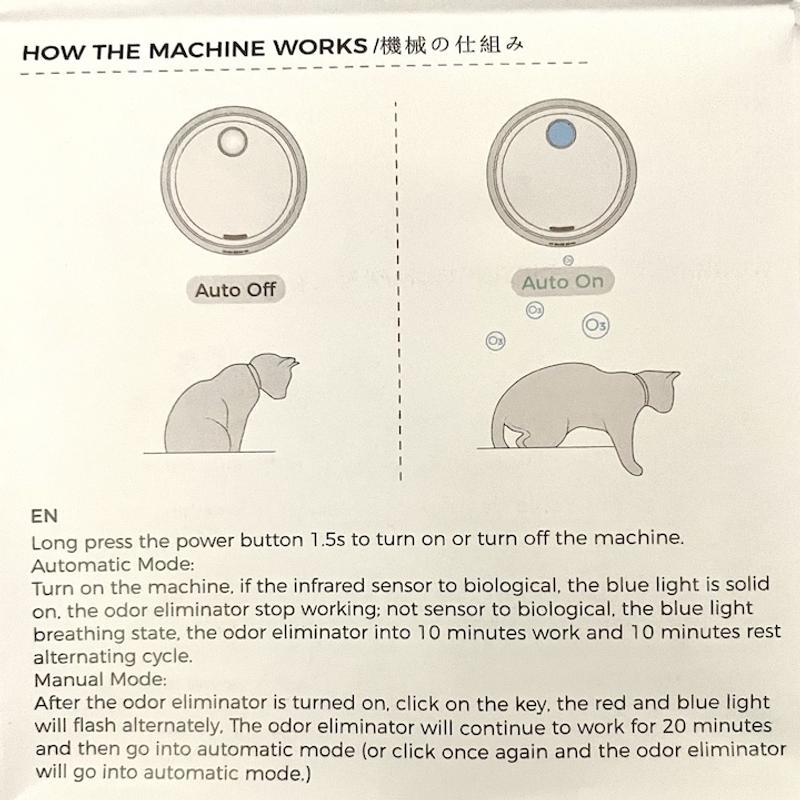 The Bueteka Odor Eliminator succeeds in removing odors without masking them with an objectionable fragrance. This is fantastic because I’m always looking for litter that doesn’t have an overwhelming scent. HOWEVER I rated this at only four stars because the company didn’t take the time to provide clear instructions in English on how to operate the deodorizer. (See photos) Also I can only assume that the “key” that they refer to in order to activate the Manual Mode is the power button. However that button can only be accessed by removing the unit from the wall.