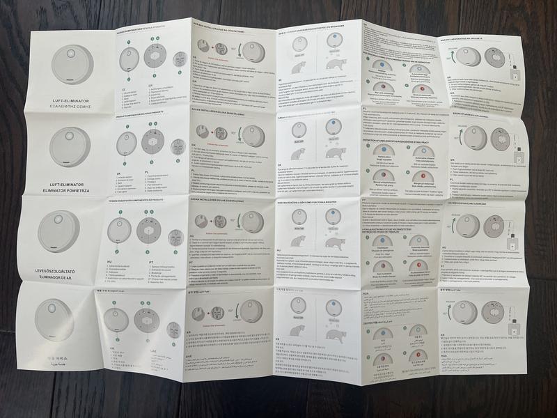 Packages arrived in tact. Directions were a bit confusing at first as seemed to be translated to English. It looks like a smoke detector with a sensor light. Once I charged up the unit with the cord provided in the box, I installed it next to the litter box as directed which was fairly easy. Unit is lit up and seems to be working. Cat doesn’t seem to mind this by the litter box. Will continue to monitor to see if this helps with litter box odor as have not noticed marked improvement yet.