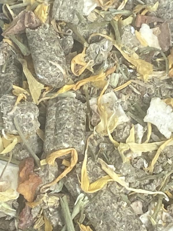 Growth of Permanent Meadows (Timothy, Meadow Fescue, Red Fescue, Meadow Foxtail, Blue Grass, Cocksfoot, Cow Parsley, Rough Dandelion, Meadow Chickweed, Common Yarrow, Lady’s Mantle, Vernal Grass, Field Clover, Ribwort, Meadow Sage, Meadow Trefoil, Tall Fescue, Meadow Bellflower, Caraway, Meadow Knapweed, Common Hornwort, Bedstraw-Meadow Thistle, Soft Tristle, Common Dandelion, Tussock Grass, True Meadowsweet, Field Hornwort, Wood Strawberry, Bird’s Vetch, Gemander Speedwell, Meadow Pippweed, True Bedstraw, Downy Meadow Oats, Common Horsetail, Field Horsetail, White Bedstraw, White Cranesbill, Fat Meadow Daisy, Field Widow’s Flower, Cuckoo’s-Flower Pink, Common Loosestrife, Field-Speedwell, Tall Oat Grass, Meadow Rye, Medium Plantain, Greater Meadow-Knap, Narrow-Leaved Vetch, Forget-Me-Nots, Meadow Saxifrage, Lesser Burnet, Creeping Cinquefoil, Cowslip, Nodding Campion, Lesser Meadow-Grass, Grass Stitchwort, Meadow Goats-Beard, Stinging Nettle, Fragrant Speedwell, Red Clover, Bush Vetch, Geneva Goutweed, Goutweed, Daisies), Oat Peel Bran, Sunflower Seed Extracted, Carrot Pomace, Wheat Bran, Linseed Extracted, Apple Pomace, Rape Seed Extracted, Parsley Stems (2%), Chicory Root, Parsnip (2%), Pumpkin Flakes (1.2%), Sweet Pepper (1%), Marigold Blossoms, Fennel Seeds, Camomile Blossoms, Papaya Dried, Brewer’s Grain, Carob Flour, Brewer’s Yeast, Calcium Carbonate, Chicory Inulin (Vegetables 6.2%).