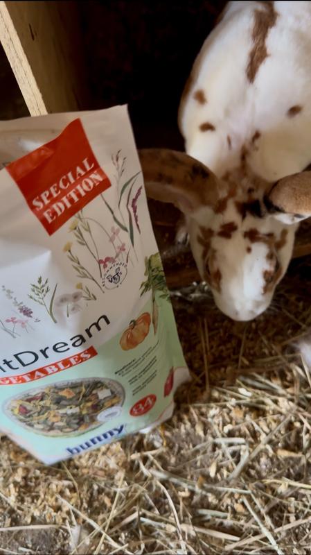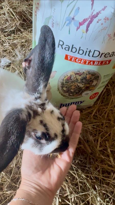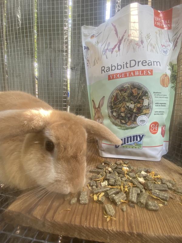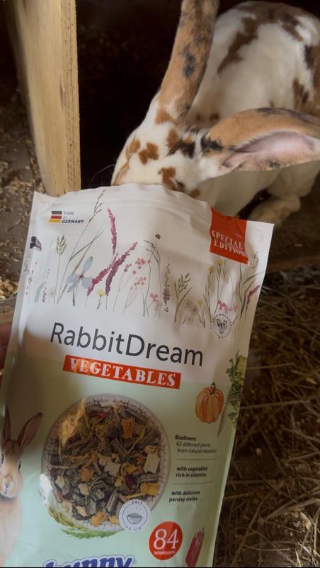 Rabbit Dream Special Edition Vegetables is a fully balanced food that can be offered freely (ad lib). Simply fill the bowl and only refill once it’s empty, your rabbit will eat only what it needs. Complement daily with fresh, lukewarm water and high-quality bunny hay for optimal 24/7 nutrition. No measuring, rationing or restriction needed. Feeding made easy!