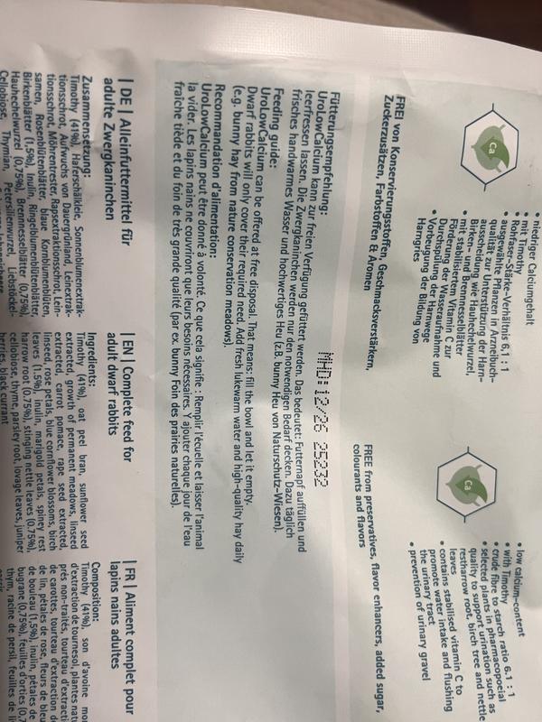 Uro Low Calcium can be offered freely (ad lib). Fill the bowl and let it empty, dwarf rabbits will only consume what they need. Complement daily with fresh, lukewarm water and high-quality hay, such as bunny hay from nature conservation meadows.