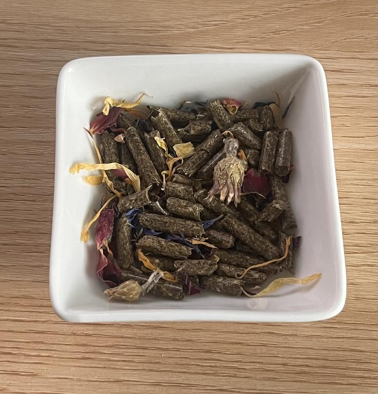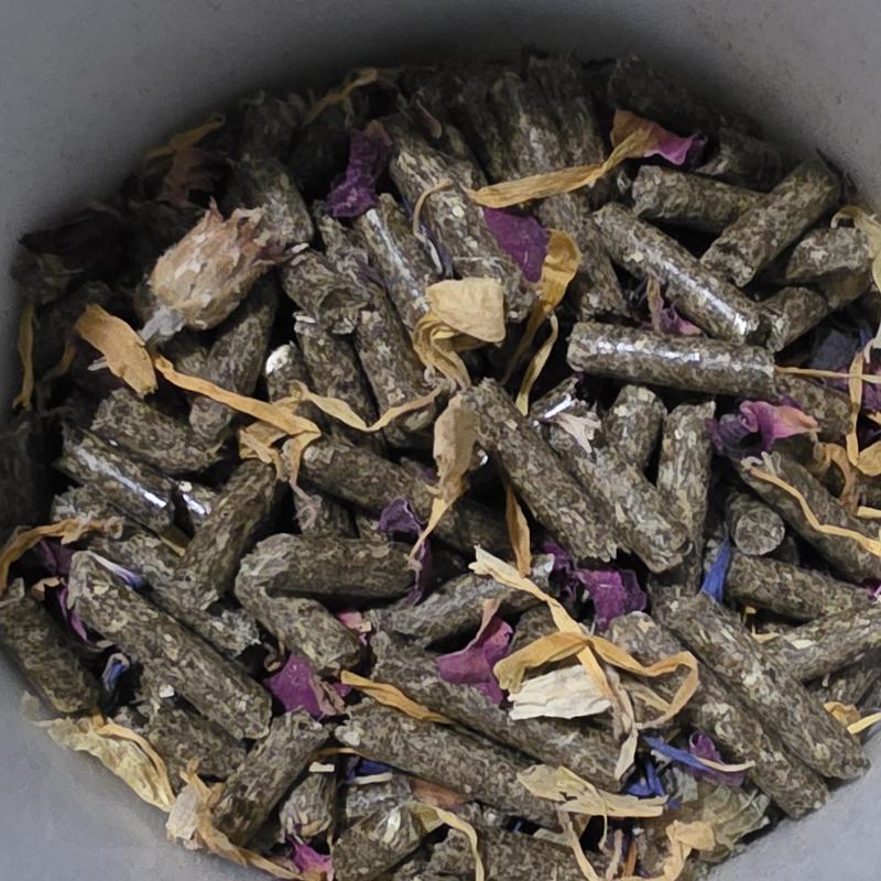 This forage mixture comes in a decent sized bag considering I only used it as a topper rather than a meal. The ingredients consist of some things to be cautious of and not feed too much at once or for every meal (sunflower seed extract, rapeseed extract, juniper berries, rest harrow root). Although it’s the first ingredient, there’s a low amount of Timothy hay. One of my rabbit’s urine will get sludgy sometimes, but it’s random and usually only once to twice each time it happens (probably less than once a month). Since I’ve used this forage, I have not noticed any sludge — but I’m not sure if that’s from this product or simply because she just isn’t sludgy right now. Hard to tell. Additionally, my rabbits did not like the forage too much (the pellet part or the flower part). One of my rabbits eats literally ANYTHING (literal trash sometimes), so I was surprised he was not too into this.