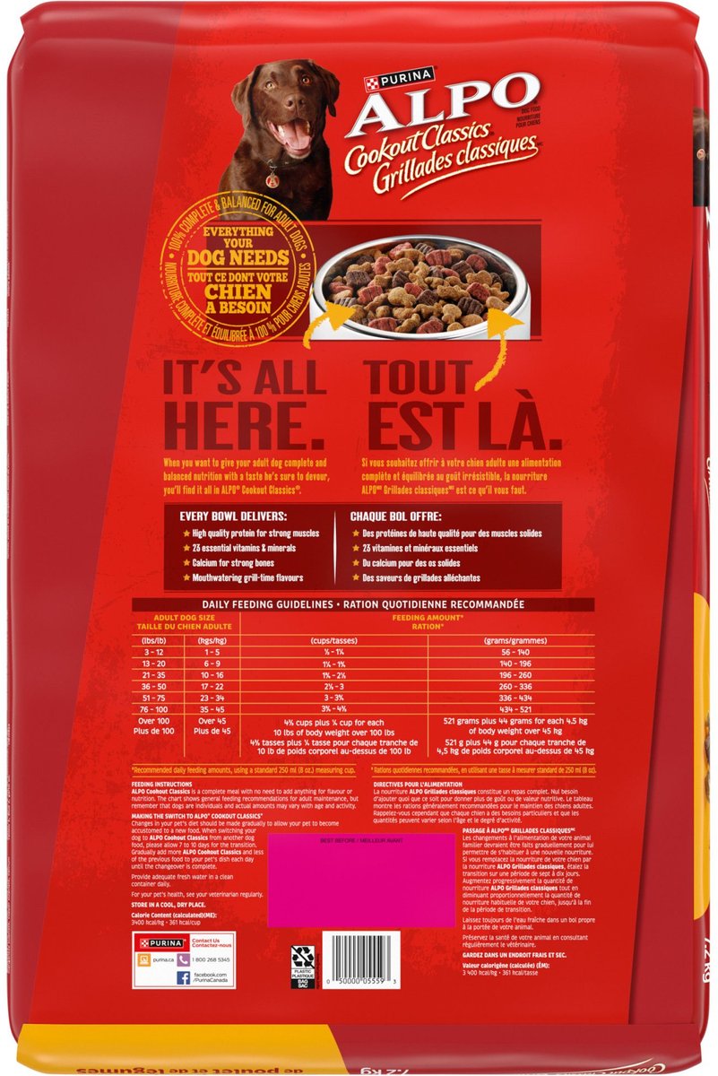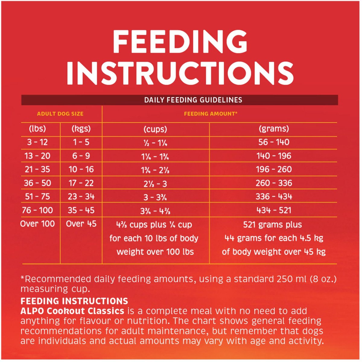 Alpo Cookout Classics is a complete meal with no need to add anything for flavour or nutrition. The chart shows general feeding recommendations for adult maintenance, but remember that dogs are individuals and actual amounts may vary with age and activity.