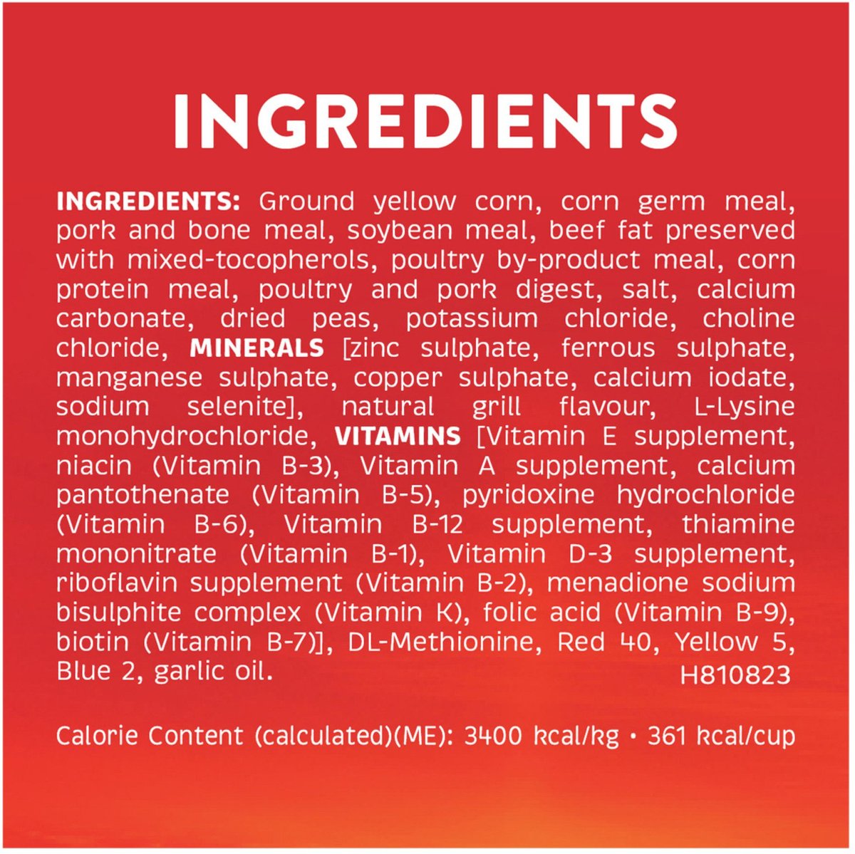 Ground Yellow Corn, Corn Germ Meal, Pork and Bone Meal, Soybean Meal, Beef Fat Preserved with Mixed-Tocopherols, Poultry By-Product Meal, Corn Protein Meal, Poultry and Pork Digest, Salt, Calcium Carbonate, Dried Peas, Potassium Chloride, Choline Chloride, Minerals [Zinc Sulphate, Ferrous Sulphate, Manganese Sulphate, Copper Sulphate, Calcium Iodate, Sodium Selenite], Natural Grill Flavour, L-Lysine Monohydrochloride, Vitamins [Vitamin E Supplement, Niacin (Vitamin B-3), Vitamin A Supplement, Calcium Pantothenate (Vitamin B-5), Pyridoxine Hydrochloride (Vitamin B-6), Vitamin B-12 Supplement, Thiamine Mononitrate (Vitamin B-1), Vitamin D-3 Supplement, Riboflavin Supplement (Vitamin B-2), Menadione Sodium Bisulphite Complex (Vitamin K), Folic Acid (Vitamin B-9), Biotin (Vitamin B-7)], DL-Methionine, Red 40, Yellow 5, Blue 2, Garlic Oil.
