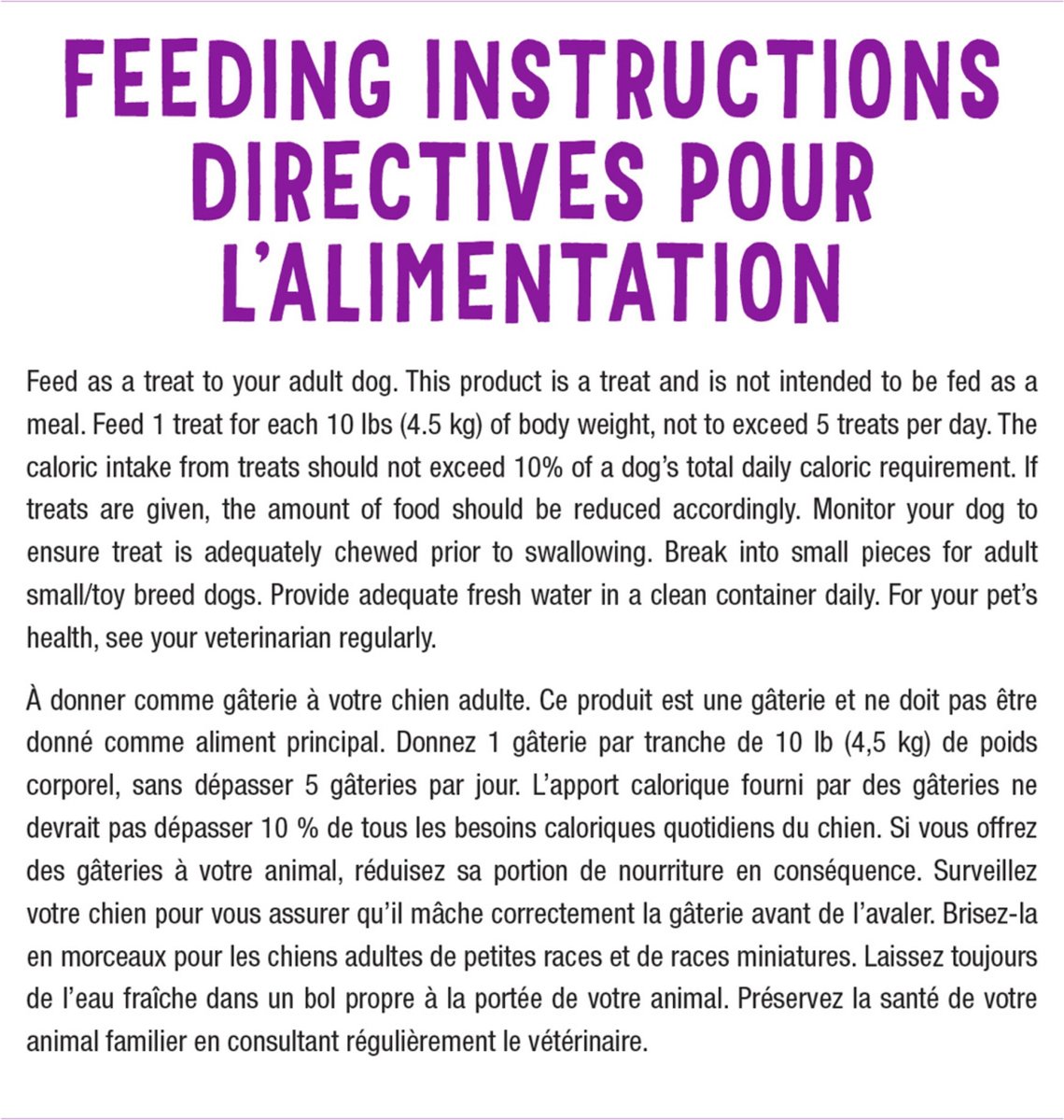 Feed 1 treat for each 10 pounds of body weight, not to exceed 5 treats per day. The caloric intake from treats should not exceed 10% of a dog's total daily caloric requirement. If treats are given, the amount of food should be reduced accordingly.