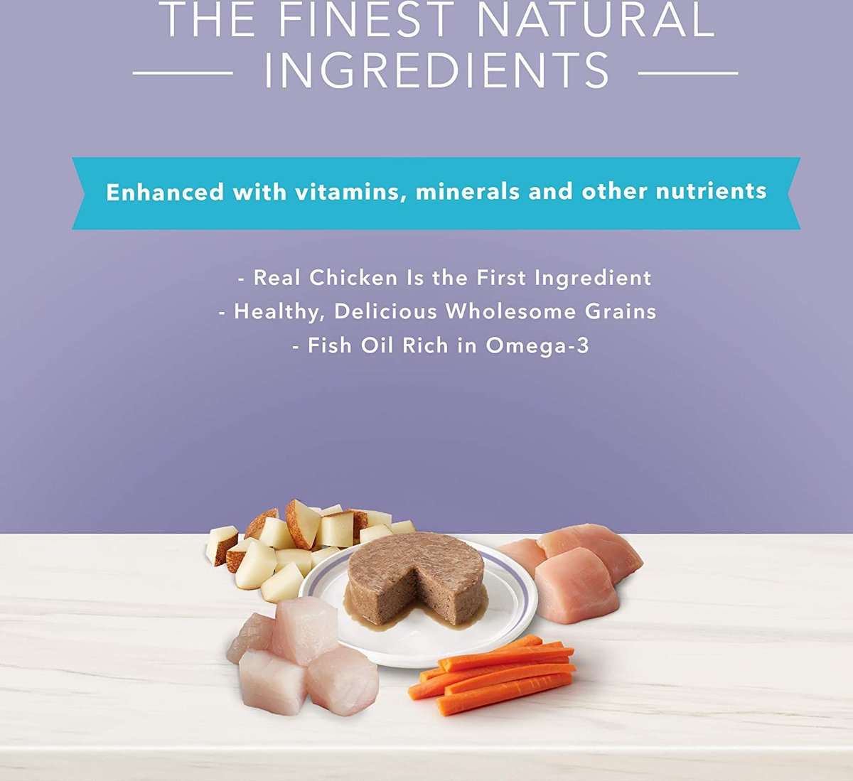 Chicken, Chicken Broth, Chicken Liver, Potatoes, Dried Egg Product, Brown Rice, Flaxseed, Pea Protein, Natural Flavour, Fish Oil, Calcium Sulfate, Carrageenan, Guar Gum, Taurine, Potassium Chloride, Sodium Acid Pyrophosphate, Cranberries, Blueberries, Choline Chloride, L-Ascorbyl-2-Polyphosphate (source of Vitamin C), Salt, Vitamin E Supplement, DL-Methionine, Iron Amino Acid Chelate, Zinc Amino Acid Chelate, Thiamine Mononitrate (Vitamin B1), Copper Amino Acid Chelate, Manganese Amino Acid Chelate, Sodium Selenite, Niacin Supplement (Vitamin B3), Calcium Pantothenate (Vitamin B5), Pyridoxine Hydrochloride (Vitamin B6), Riboflavin Supplement (Vitamin B2), Vitamin A Supplement, Biotin (Vitamin B7), Potassium Iodide, Vitamin D3 Supplement, Vitamin B12 Supplement, Folic Acid (Vitamin B9), preserved with Mixed Tocopherols.