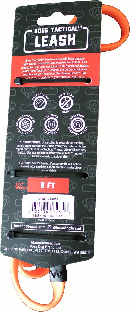 Boss Dog Tactical TPU Dog Leash, Hunter Orange, 6-ft