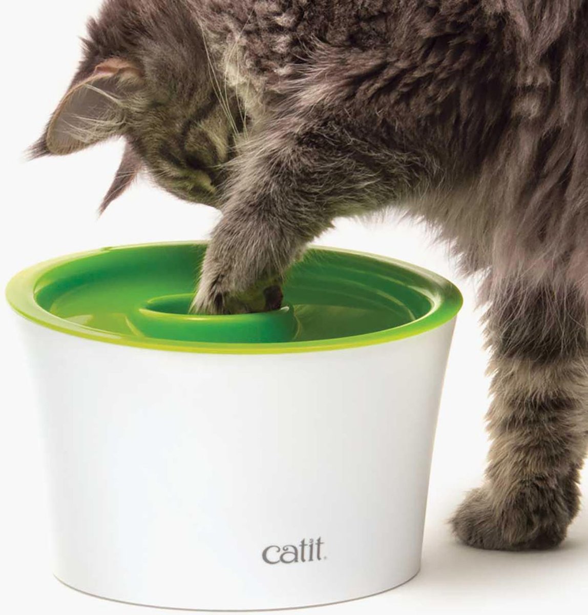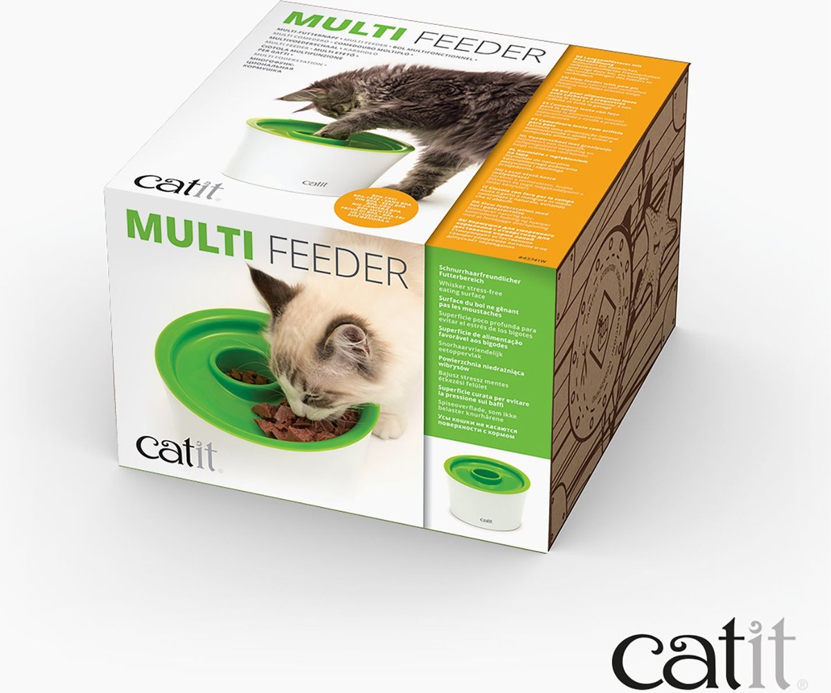This is my second Catit cat feeder. The other was too large and too loud, but I needed to challenge my fat Einstein Kitty. This is a simple item and it is easy for cats to use, but it still requires more effort for them to eat than than just a bowl or feeder. I wish it was a bit more complicated and held a bit more, but the cats are eating less and I am happy with it.