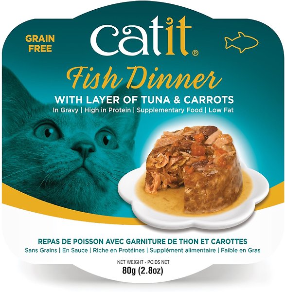 - As with all fish-based cat foods, Catit Fish Dinner is intended for intermittent or supplementary feeding only. Add to your cat's dry food to make a complete and nutritious meal.