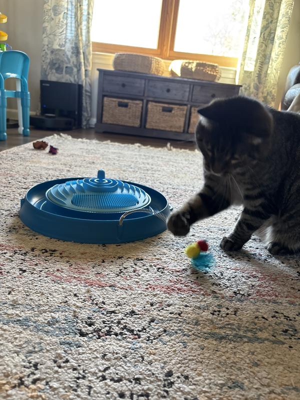 My cats ignored this toy for the first few hours. I thought it was a bust, until my Leia began playing with it. She loves it! It doesn’t provide her with much exercise, as she lays on her side as she bats the ball round and round, but it’s entertaining her, so I’m happy. I can even hear the whirl of the ball as she plays with it in the middle of the night. It is also very well made of sturdy plastic.