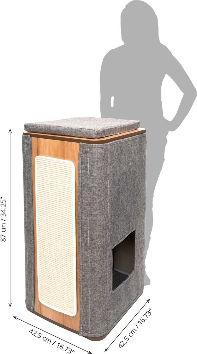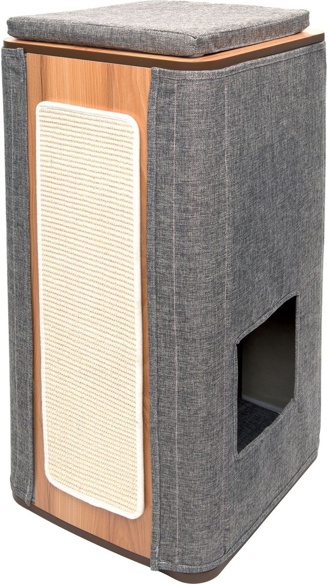 This cat condo is easy put together and has an attractive design, but the quality doesn’t hold up. My cat has already destroyed the cushion for the bottom level and all the sides are fraying. My cat enjoys using it as a perch and scratcher, but doesn’t fit too well on the inside. I would only recommend it if you find it heavily discounted. It is not worth the full price in my opinion.