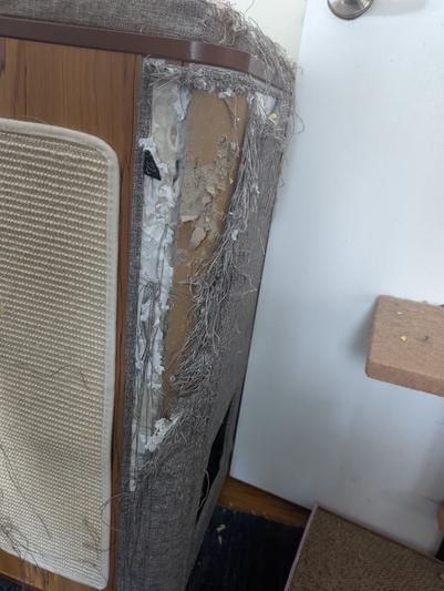 I do love the look of this tower. Or I did when I got it. It's less than a month old and it already has no corners. The scratch pad on the front doesn't even get a sideways glance while they sharpen their claws on the corners. Perhaps the cover would be better served made out of something less attractive to sharp claws