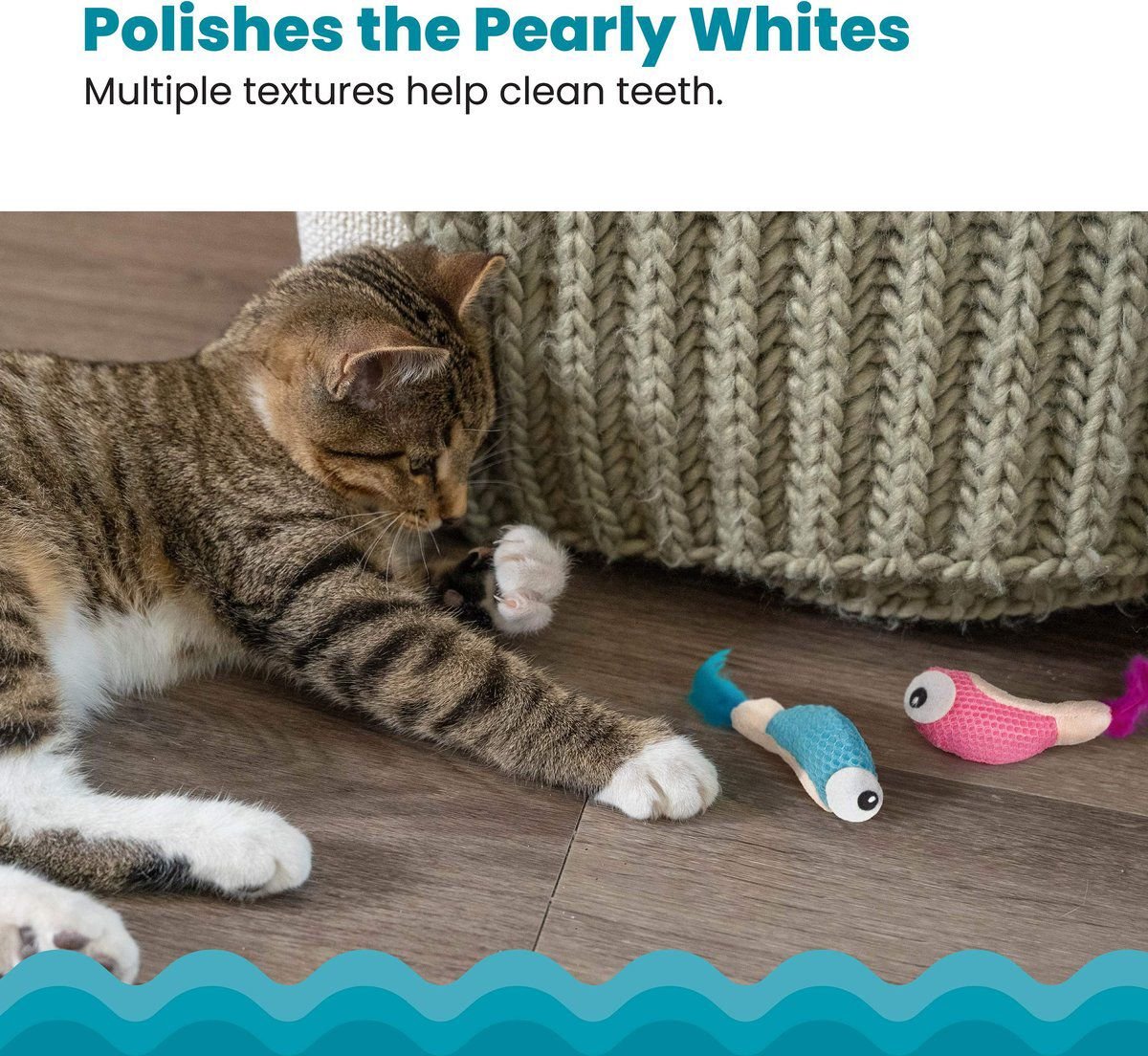 - This cat toy features material that gently cleans plaque and tartar off your kitty’s teeth as they play.