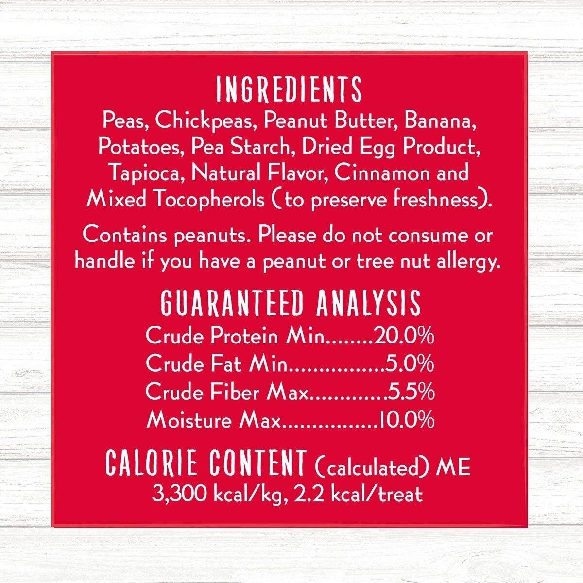 Peas, Chickpeas, Peanut Butter, Banana, Potato, Pea Starch, Dried Egg Product, Natural Flavors,Tapioca, Cinnamon and Mixed Tocopherols (to preserve freshness).