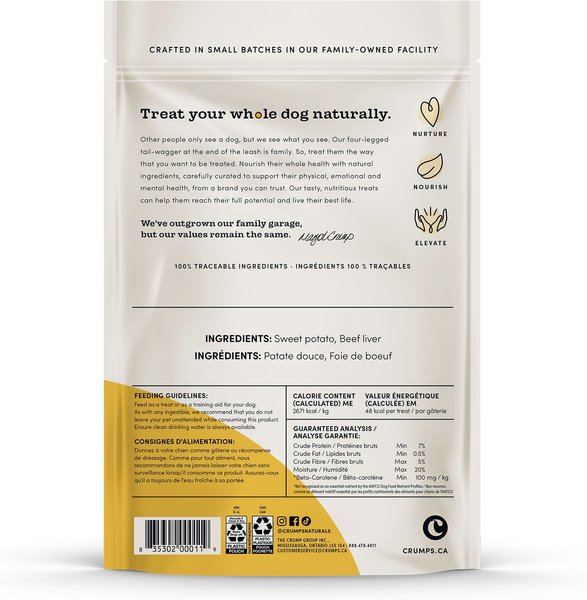 Crumps' Naturals Sweet Potato & Liver Chews are made in Canada using ingredients strictly from North America. The sweet potato is sourced from North Carolina, USA. The liver is sourced from Ontario, Canada.