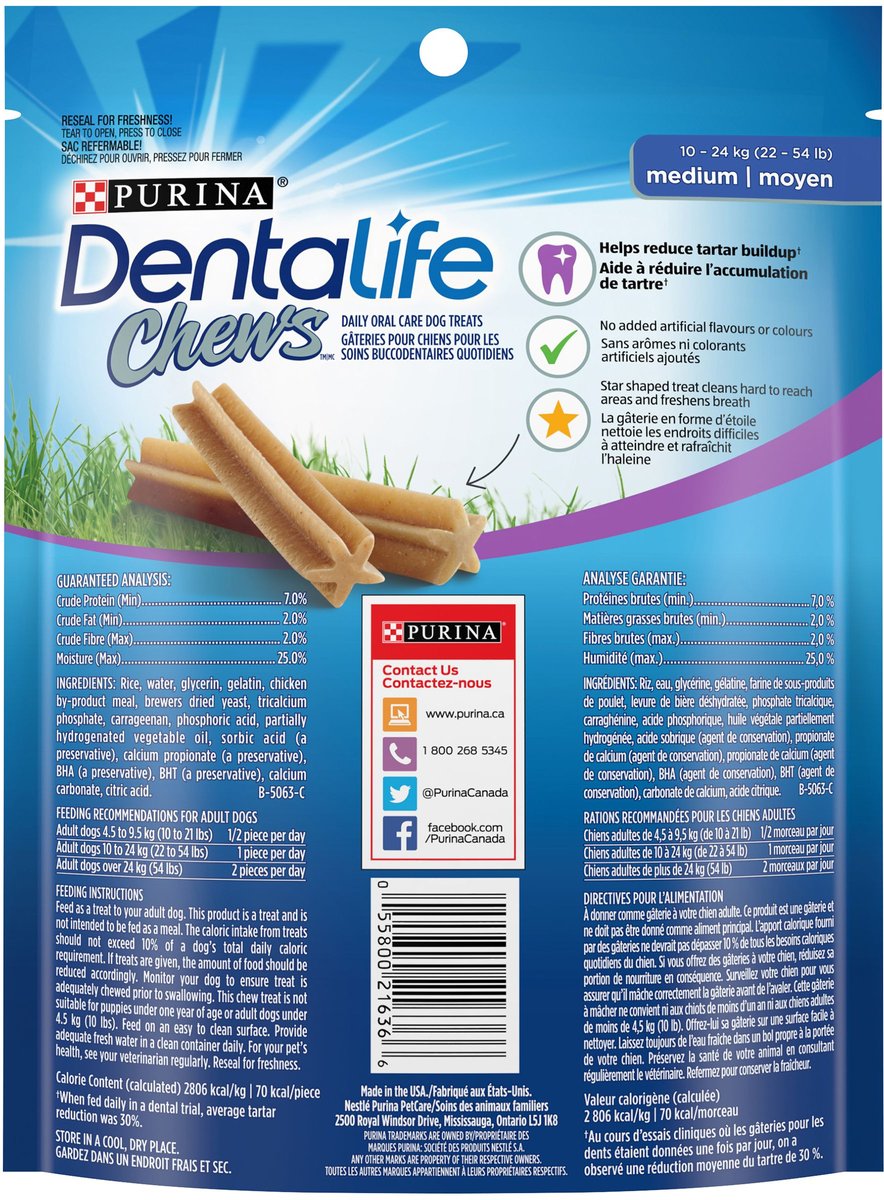 These dental treats have ridges and a chewy texture that helps aid in cleaning the teeth, in even the hard to reach places. It also contains ingredients that help freshen their breath.